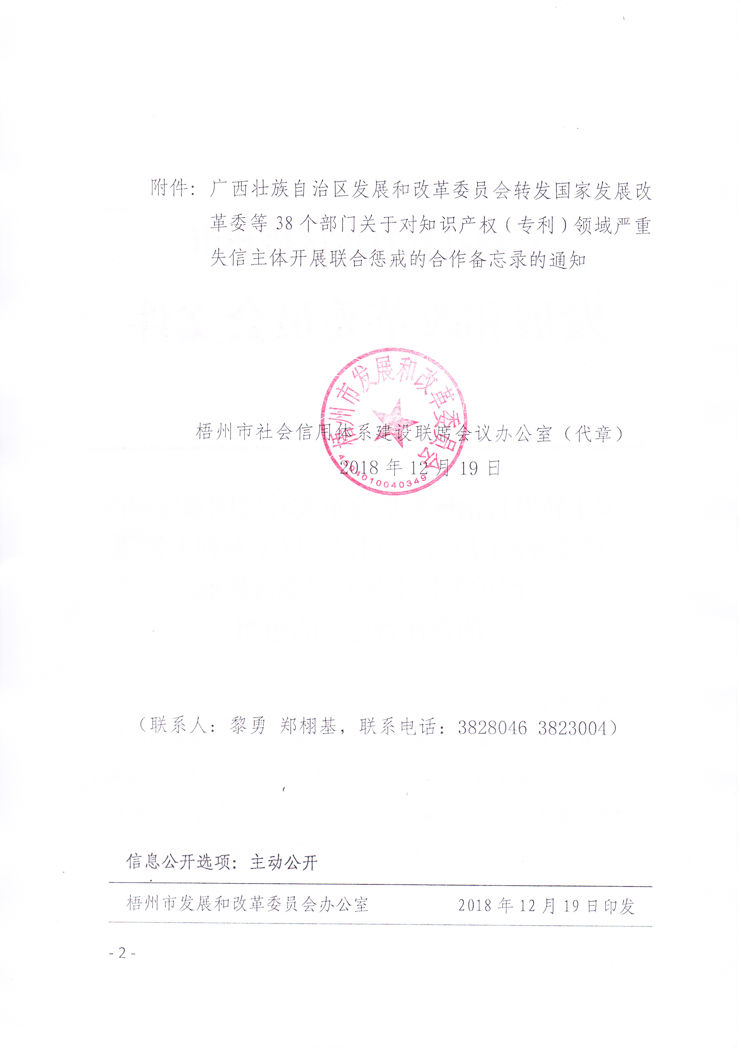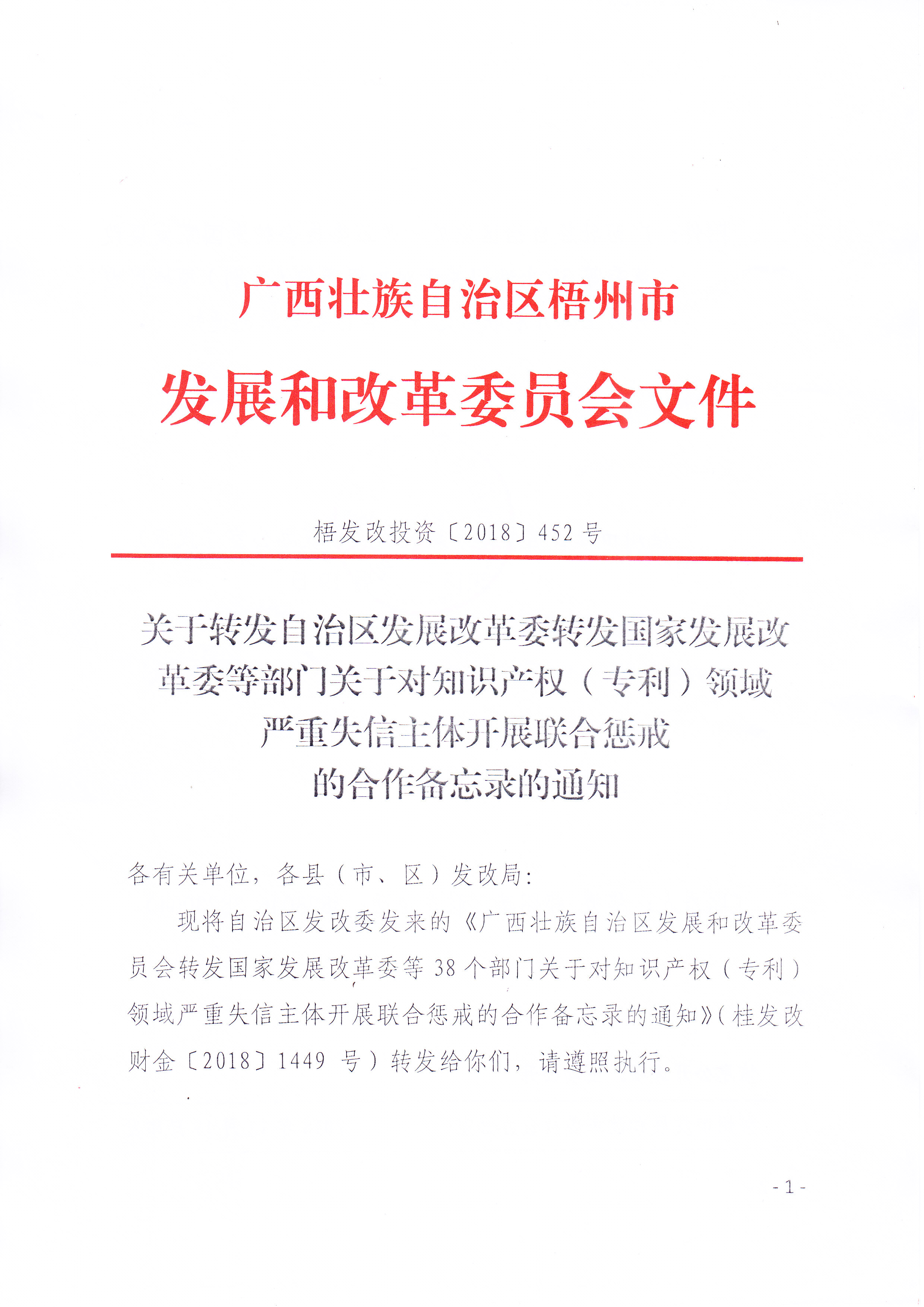 1、广西壮族自治区发展和改革委员会转发国家发展改革委等38个部门关于对知识产权(专利)领域严重失信主体开展联合惩戒的合作备忘录的通知正文