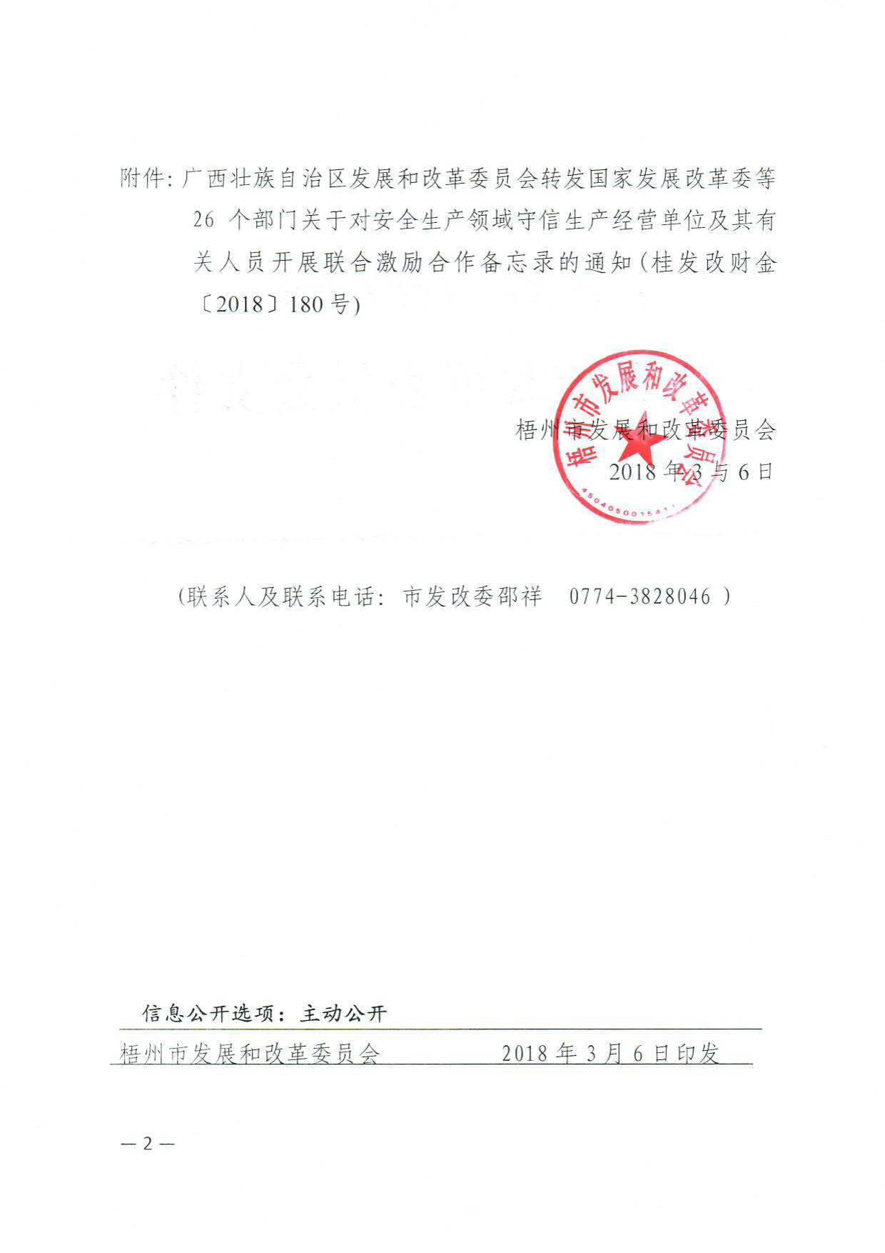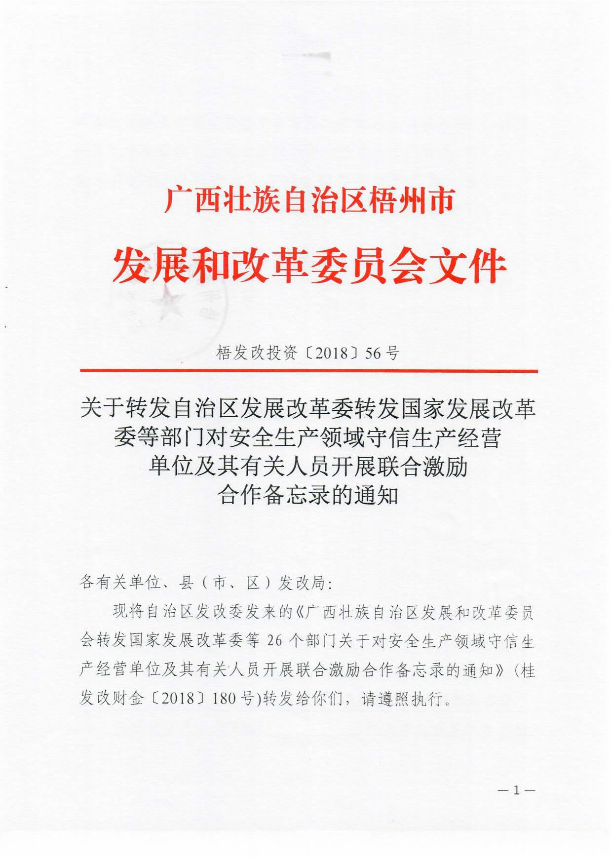 关于转发对安全生产领域守信生产经营单位及其有关人员开展联合激励合作备忘录的通知-梧发改投资[2018] 56号