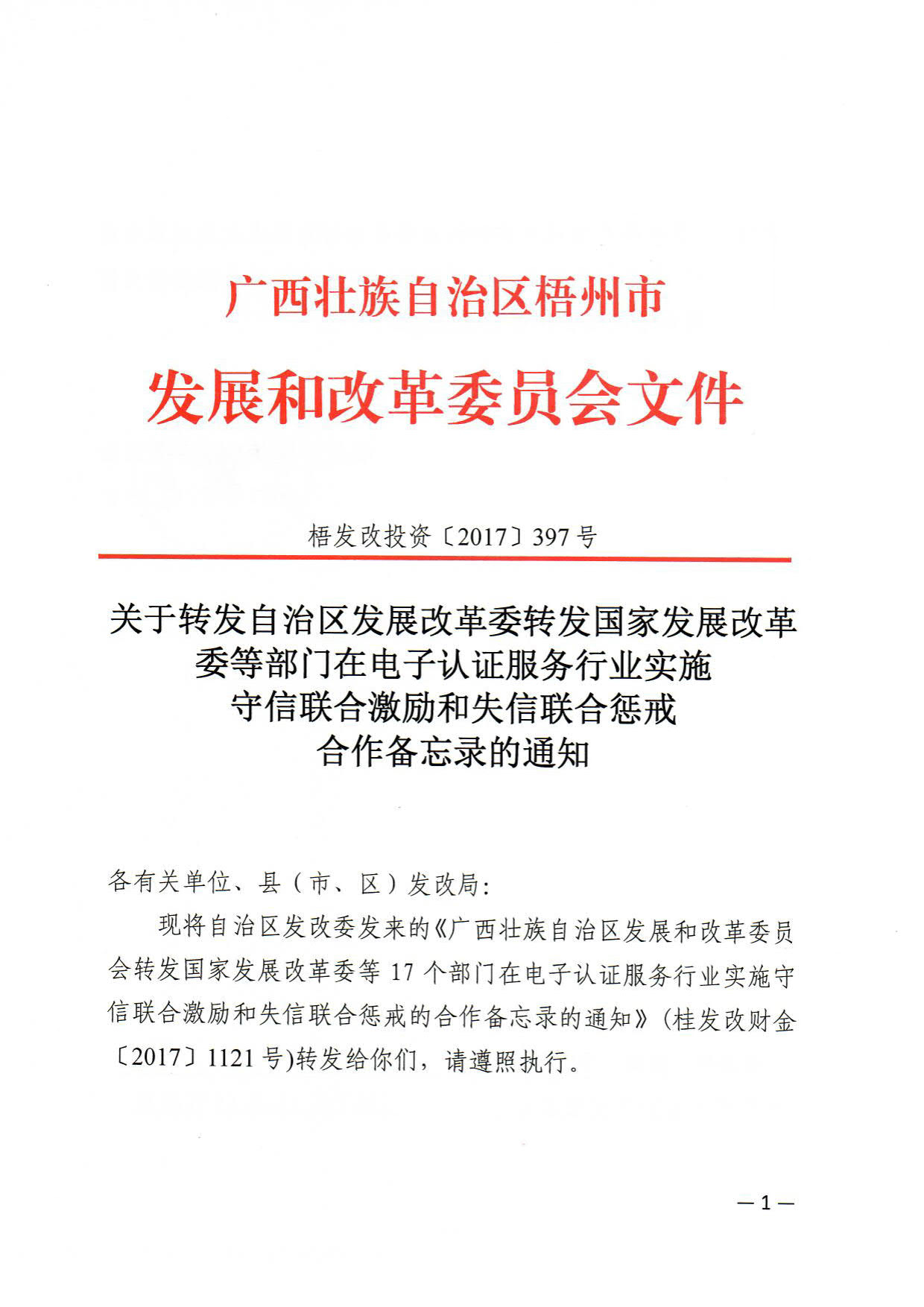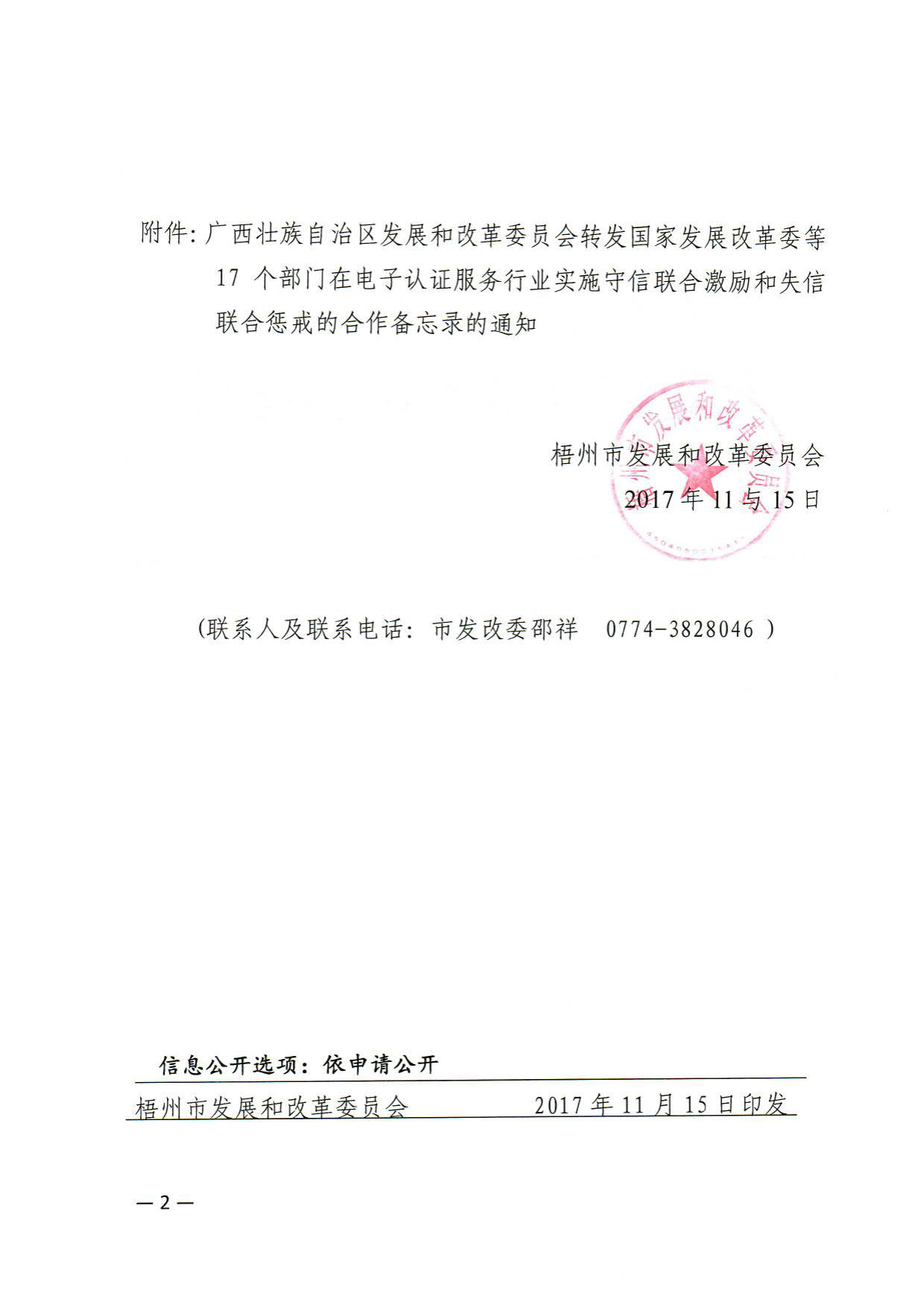 附件:广西壮族自治区发展改革委转发国家发展改革委等17个部门关于在电子认证服务行业实施守信联合激励和失信联合惩戒合作备忘录的通知