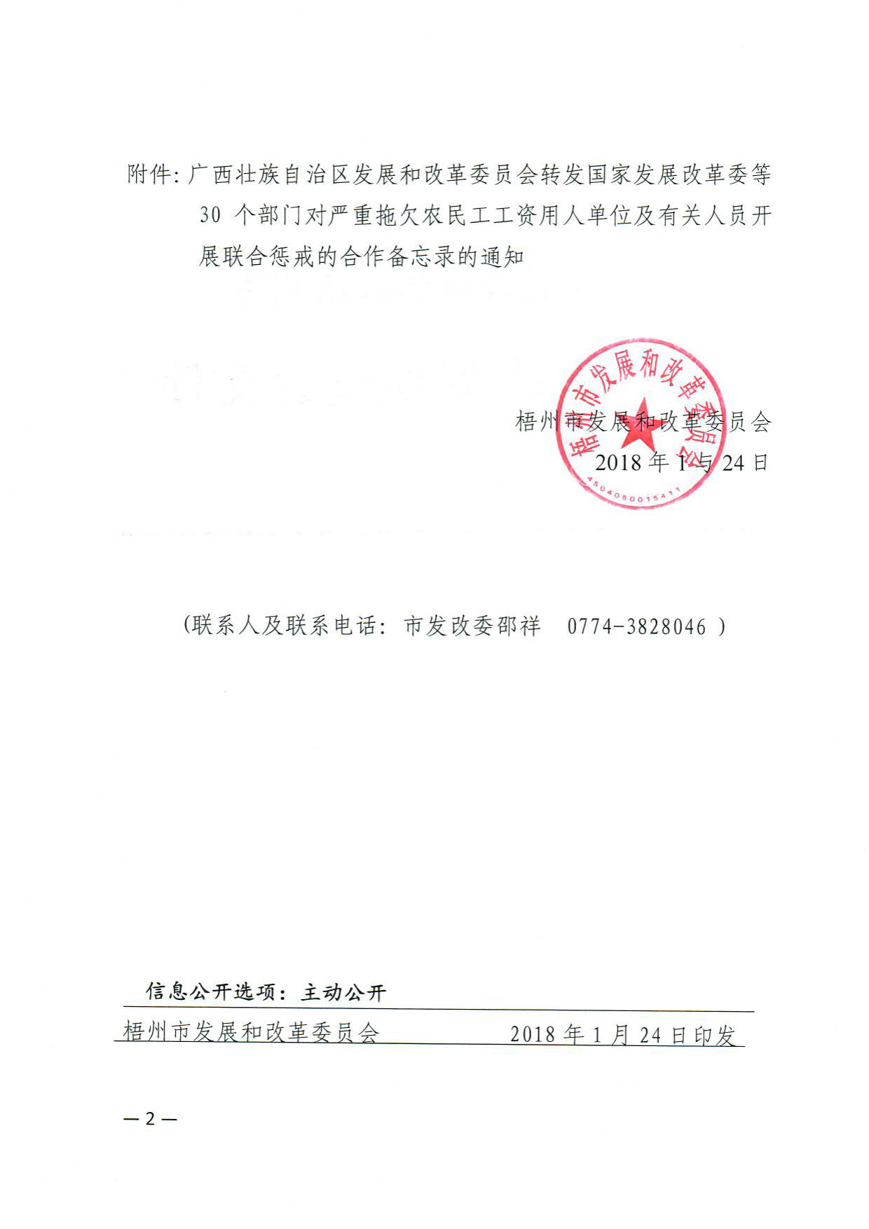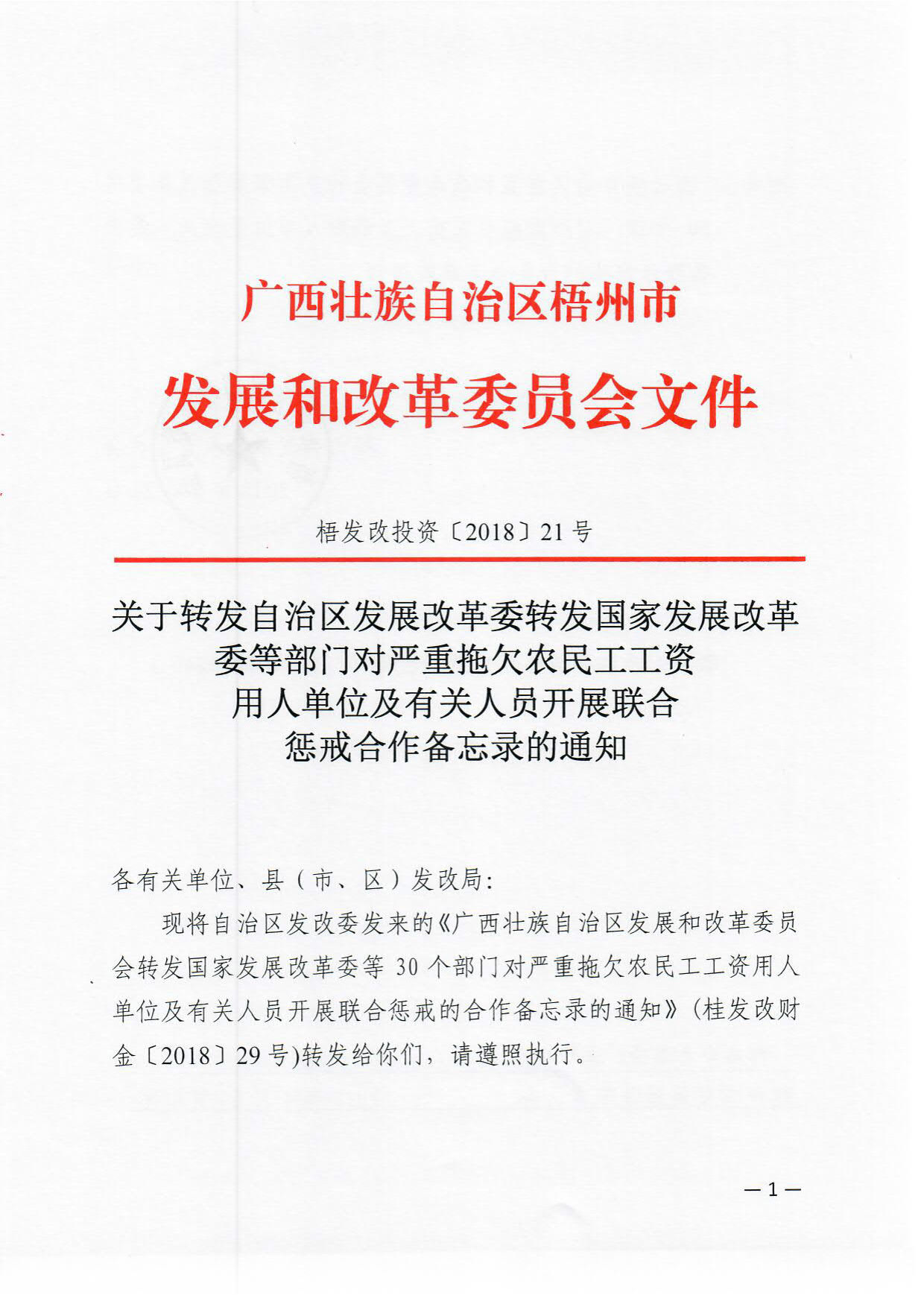 转发《对严重拖欠农民工工资用人单位及有关人员开展联合惩戒》-梧发改投资〔2018〕21号
