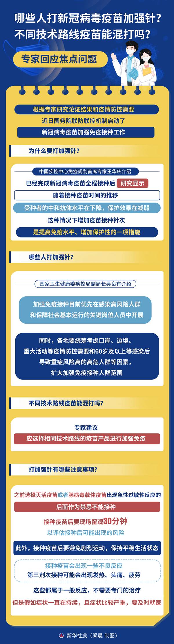 根据专家研究论证结果和疫情防控需要,近日国务院联防联控机制启动了新冠病毒疫苗加强免疫接种工作。哪些人打新冠病毒疫苗加强针?不同技术路线疫苗能混打吗?打加强针有哪些注意事项?国务院联防联控机制有关专家对焦点问题进行回应。