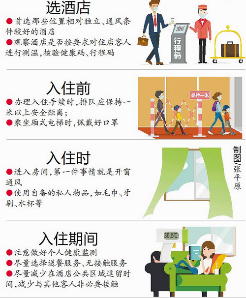 其次,应注意在入住酒店期间要做好个人防护。办理入住手续时,排队应保持一米以上安全距离;乘坐厢式电梯时,一定要注意佩戴好口罩。条件允许时,尽量选择单人房。