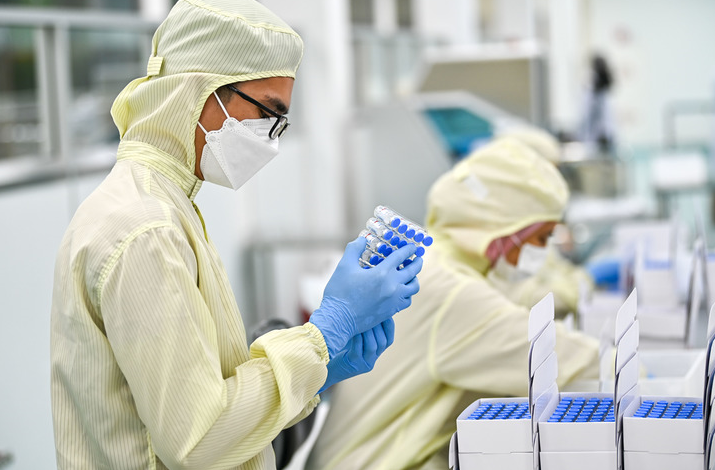 2021年10月5日,马来西亚吉隆坡,一名工人在包装本地灌装生产的科兴疫苗。新华社记者朱炜 摄