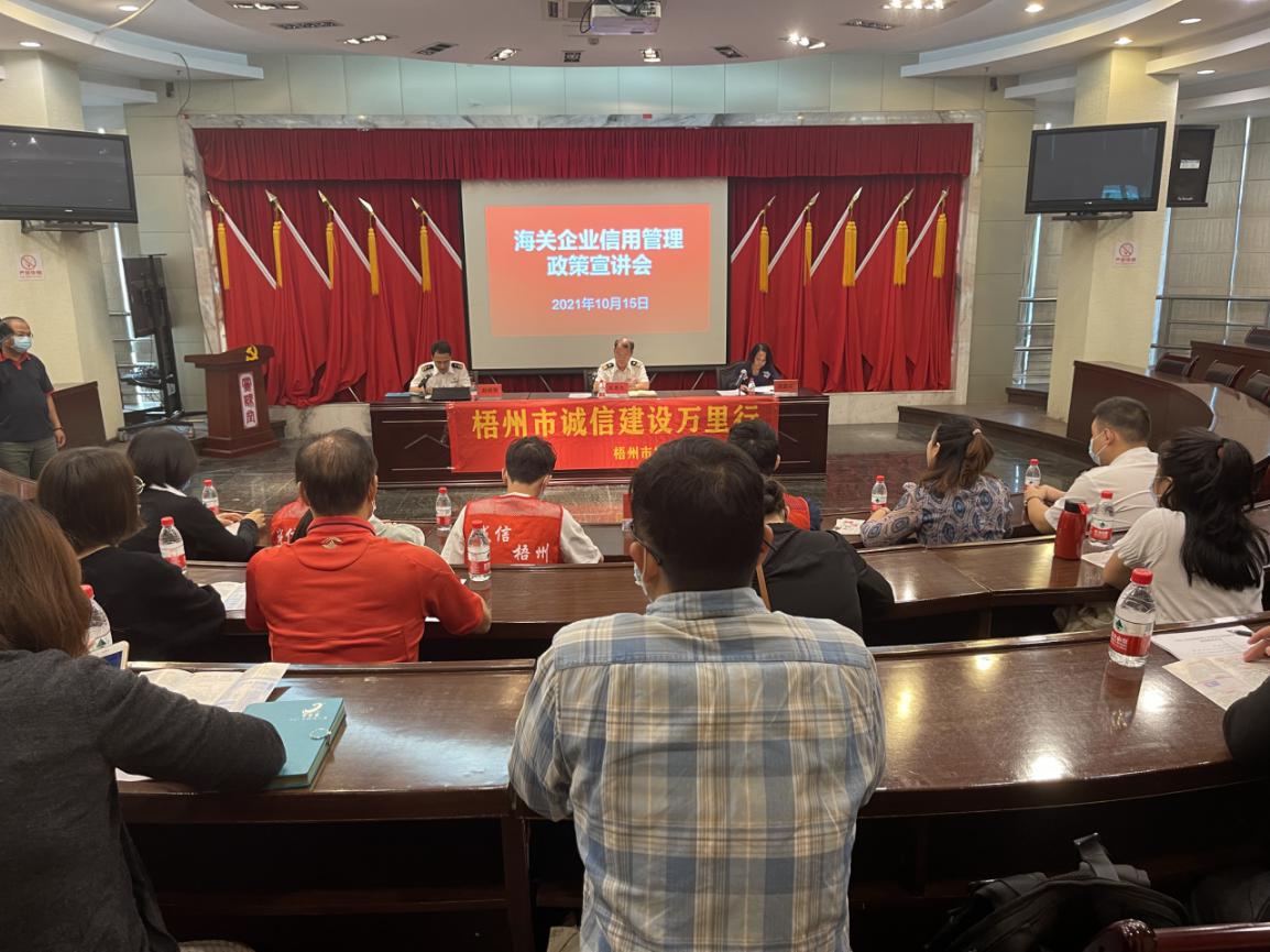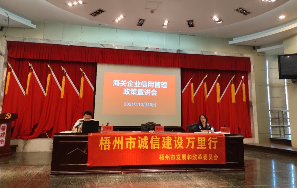 为深入推进我市社会信用体系建设工作,倡导信用激励机制,扩大信用建设成果宣传效果,提高企业知信学信用信管信意识。2021年10月15日上午由梧州市发展和改革委员会和梧州市海关联合组织举办企业信用管理政策宣讲会,各园区积极组织符合条件的20家外贸优秀企业代表参会。