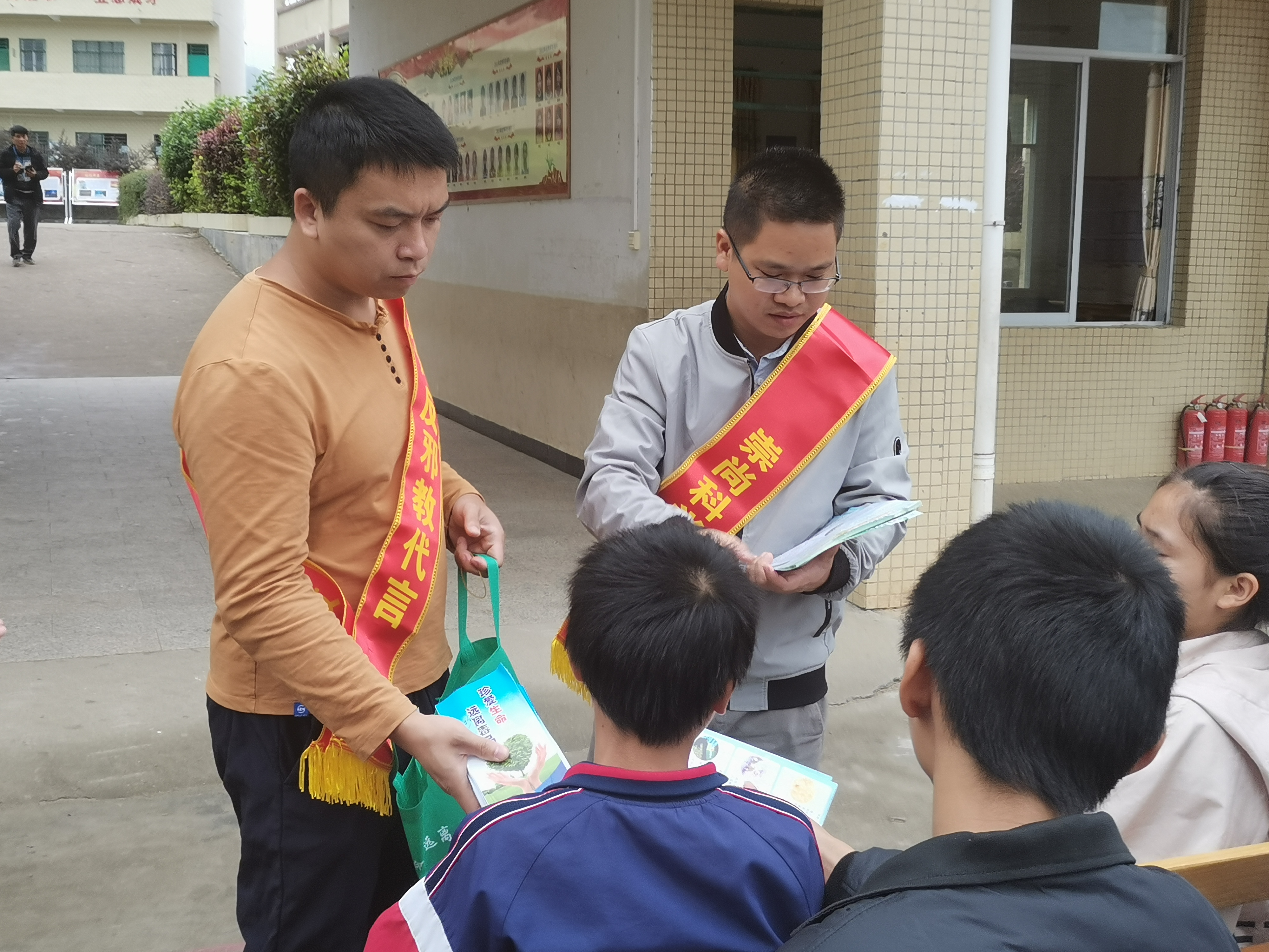 镇工作组人员在为小学生发放宣传资料、手册读本