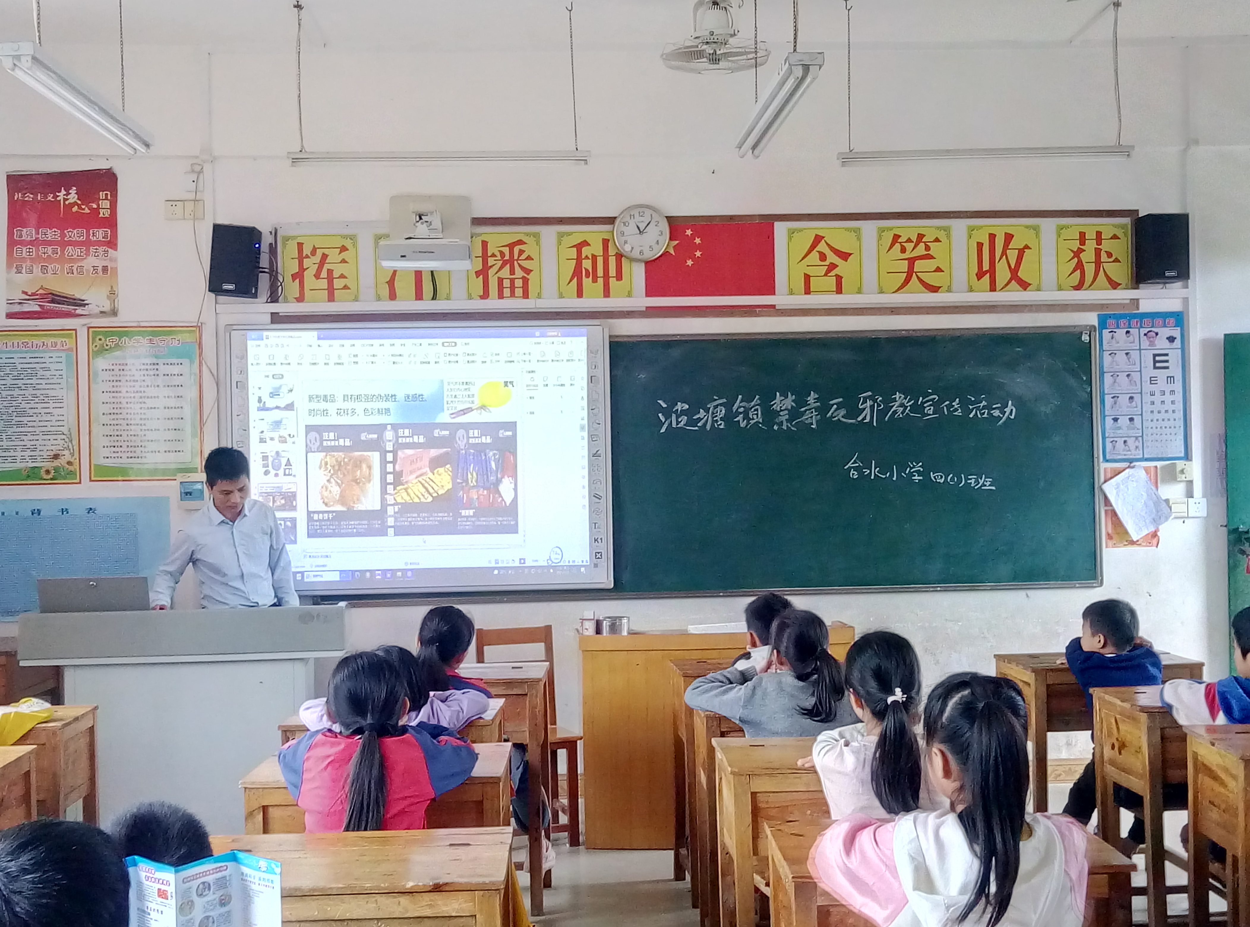 11月3日,镇党委副书记、镇长在波塘镇合水小学,为全校师生上“禁毒暨反邪普法”专题教育课