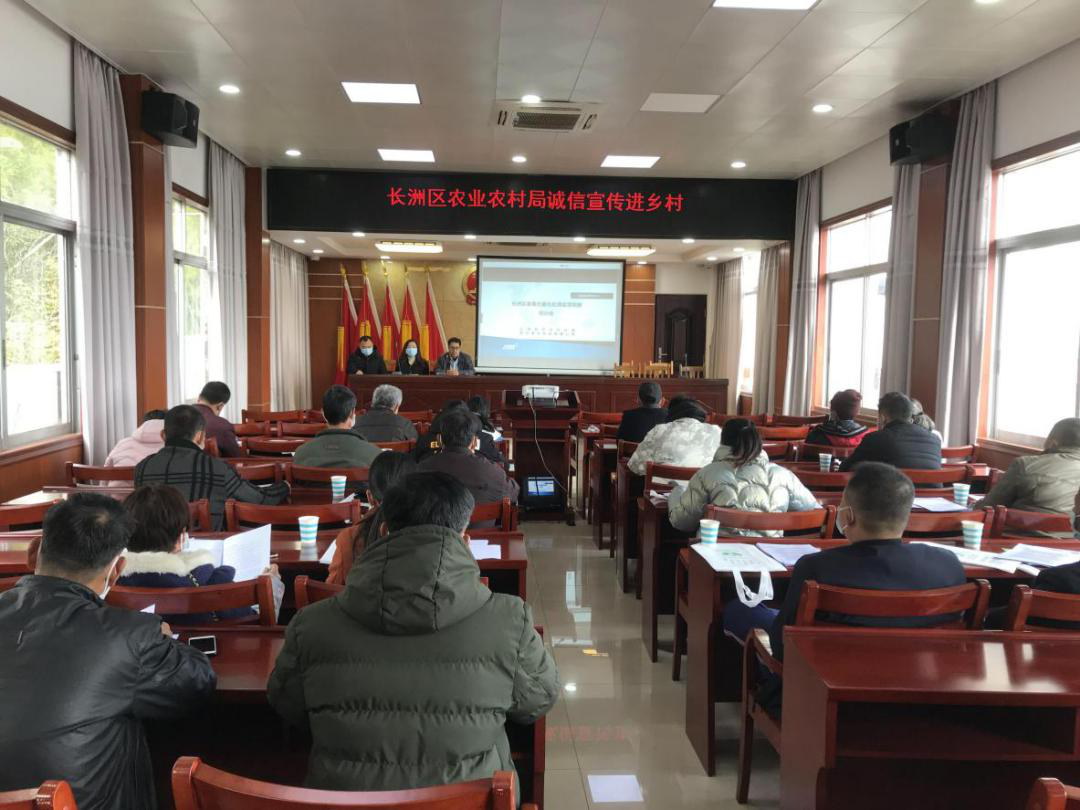 2022年1月19日,长洲区农业农村局在倒水镇政府开展了“诚信宣传进乡村”活动。在会上,讲解了养殖户诚信经营的重要性,广泛宣传农产品质量安全法律法规、安全使用农药知识,增强农产品生产经营者安全生产和诚信守法意识,向养殖户传授健康养殖技术、强调规范用药,增强养殖户的质量安全意识。