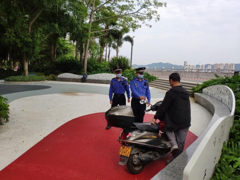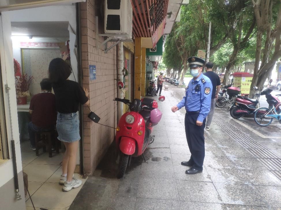 劝导来西堤公园游玩的市民将电动车停放到指定位置。