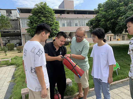 (工作人员正在现场讲解灭火器材的正确使用方法与操作流程)