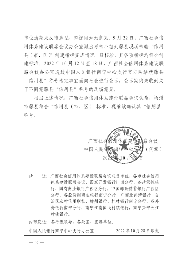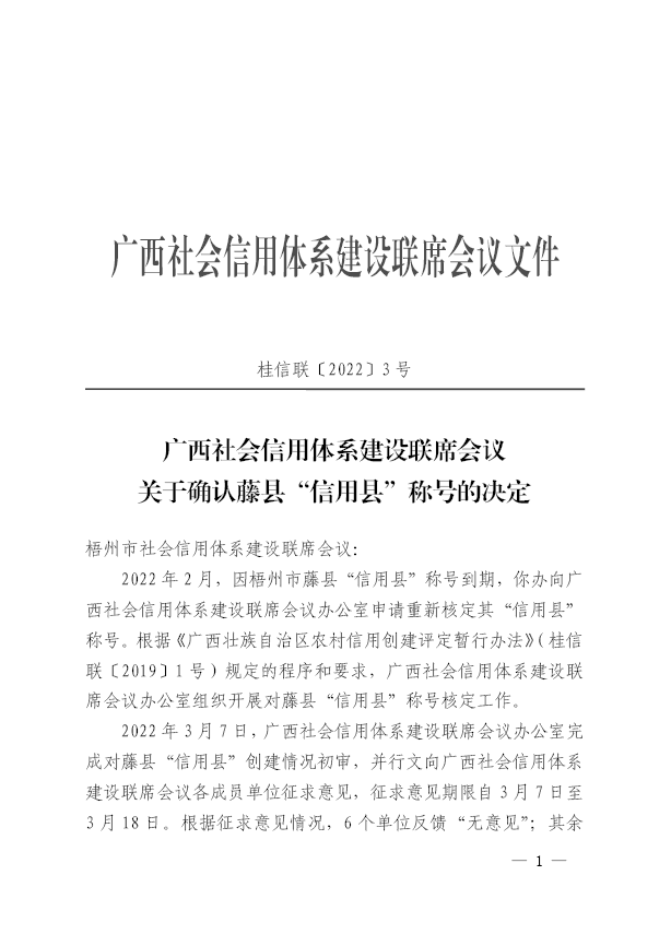 近日,我市藤县获广西壮族自治区社会信用体系建设联席会议继续确认为“信用县”,为《广西壮族自治区农村信用创建评定暂行办法》(桂信联〔2019〕1号)实施以来全区首个通过到期重新核定的“信用县”。