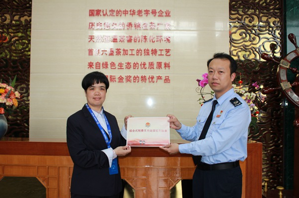 广西梧州茶厂有限公司是广西壮族自治区合作联社直属企业,始建于1953年,作为广西唯一一家获得“中华老字号”品牌的六堡茶企业,目前是中国最大的六堡茶精加工企业和国家农业产业化重点龙头企业,该企业诚信良好,深得广大群众信任和满意,享有“中国六堡茶工业的摇篮”之美誉。近年来,梧州市万秀区税务局就网上申报、发票领用、税费优惠、办税流程等方面为企业提供精细化辅导,在税务部门的帮助下,该公司享受到多项优惠政策,发展一路向前。