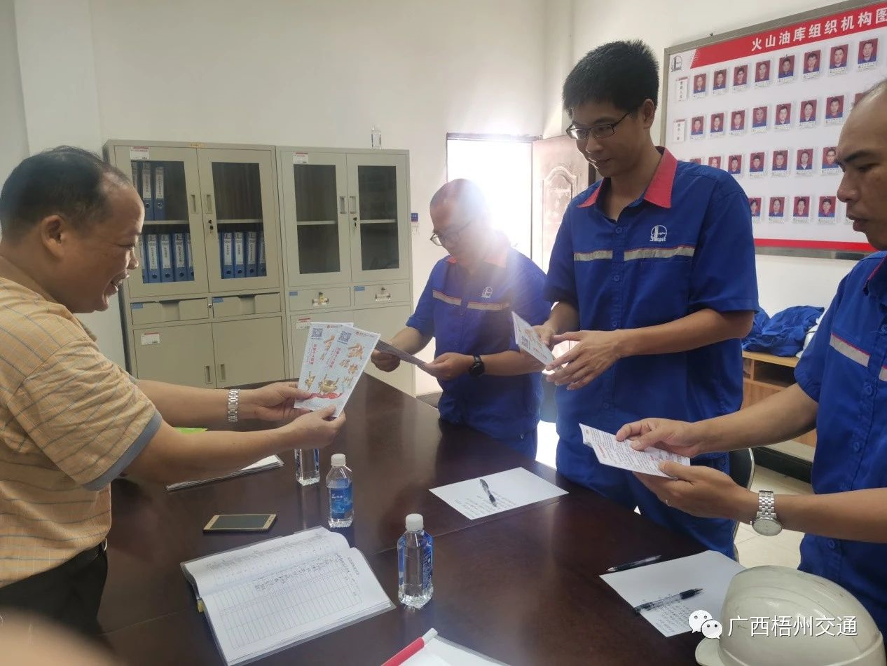 在中石化火山油库码头趸船现场,调研组详细了解了设备操作运行、船舶靠泊、隐患排查、防汛防溺水工作等情况,抽查了作业现场及趸船值班人员值班值守、在岗人员对设备操作、应急处置规程等情况。同时,调研组查阅台账,了解码头生产经营、宣传教育、人员持证等情况,对调研中发现的安全隐患问题提出整改意见,要求限期整改,并要求企业认真开展安全生产月活动,加强宣传教育和隐患排查、整治,确保安全生产月活动取得成效。调研组还开展了信用宣传活动,张奕带头向码头管理人员发放信用宣传手册,宣传与信用相关法规政策。