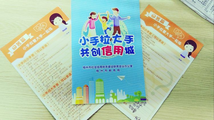 为进一步拓展诚信文化和征信知识教育实践的深度与广度,人民银行梧州市中心支行和梧州市发改委积极履行社会信用体系建设工作牵头单位职责,联合梧州市教育局于2018年1月至2月期间在全市开展为期两个月的“小手拉大手 共创信用城”活动,并通过制作活动手册,构建起学校、家庭、社会“三位一体”的诚信文化宣教模式。活动期间,全市各小学及幼儿园根据校园特性及现有教学资源,组织开展丰富的诚信主题及信用实践活动,引导学生与家长共同参与,使诚信文化和征信知识在中小学德育教育课程中得到有效的延伸。