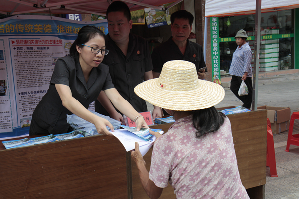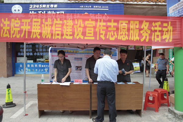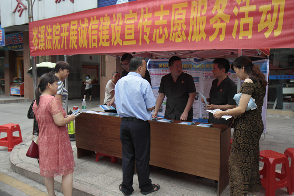 6月19日上午,岑溪法院组织干警到岑城镇政府门口开展诚信宣传志愿服务活动,努力营造“守信光荣,失信可耻”、“诚信做人、诚信做事”的良好社会环境。