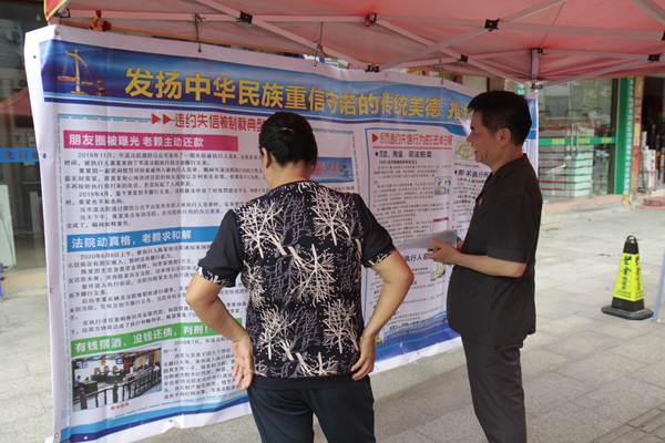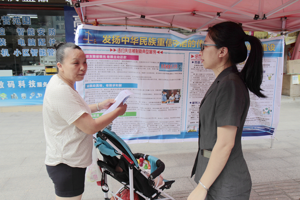 岑溪法院通过设置法律咨询台、宣传海报,向群众发放普法宣传资料、失信人名单,以面对面交流方式向群众介绍法院失信典型案例、失信惩戒方法、法院执行措施等,通过反面典型案例对于失信联合惩戒政策进行宣传,解答被执行人被纳入失信人名单的法律后果,引导群众诚实做人、诚信经营,继承发扬中华民族重信守诺的传统美德,弘扬与社会主义市场经济相适应的诚信理念、诚信文化、契约精神。