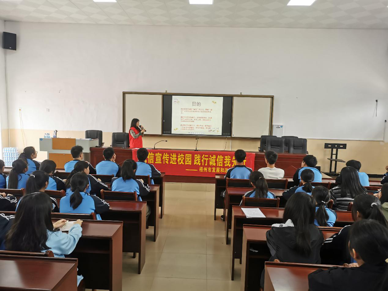 2021年3月16日上午,梧州市发展和改革委员会到苍梧高级中学组织开展“诚信宣传进校园 践行诚信我先行”主题班会宣传活动。学校组织近200名学生参加主题班会。