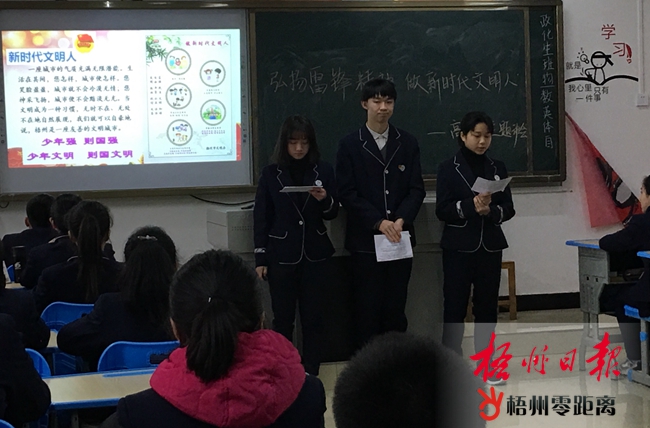 2月25日,梧州一中高中部1709班围绕“弘扬雷锋精神、做新时代文明人”主题组织开学第一课,以主题班会形式引导同学们从身边小事做起、从自己做起,说文明话、做文明事、当文明人。 梁燕如 梁励 摄