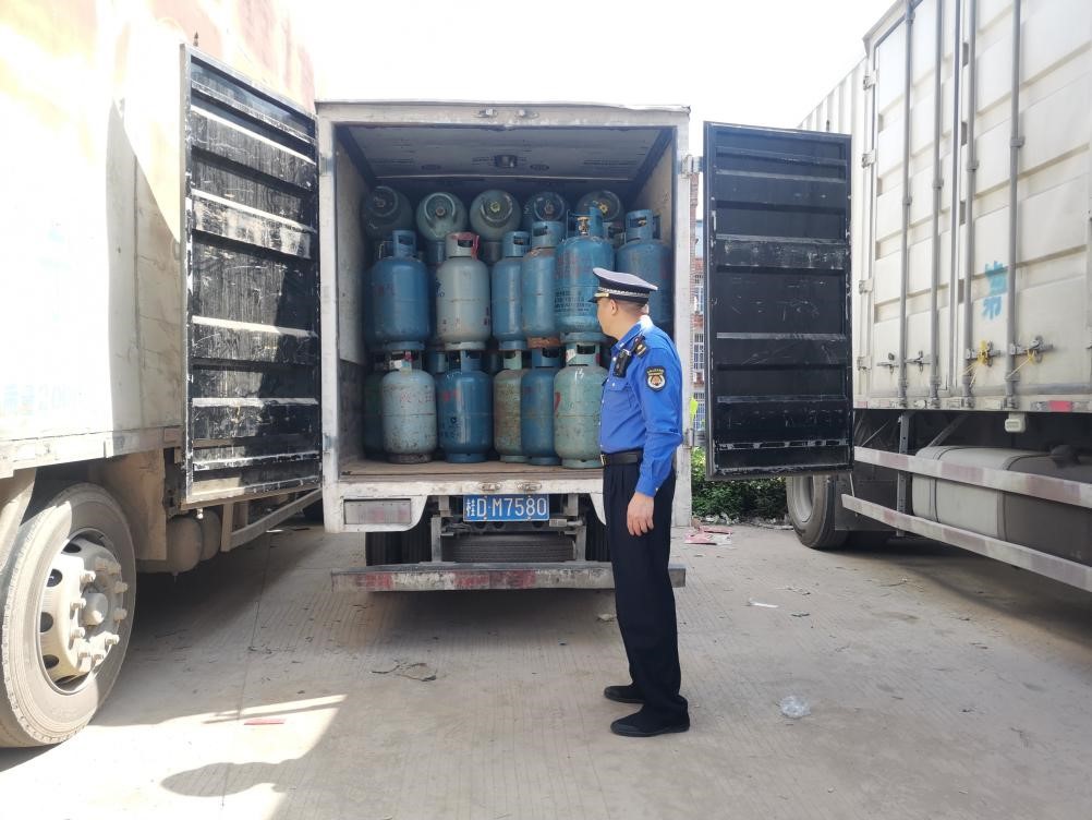 联合执法人员到达先达工业园后,发现该货车停放在园区内货物仓库旁,但未见司机。车厢内上下三层堆满锈迹斑斑的蓝色液化石油气钢瓶。这些钢瓶即是我市更换“小黄瓶”之前所使用的,且来源不明。经执法人员核查,该货车未取得道路危险货物运输许可,由于普通货车不具备安全运输、储存液化石油气的功能,这辆装载液化石油气的货车一旦发生事故后果将不堪设想,严重威胁到人民群众的生命财产安全。