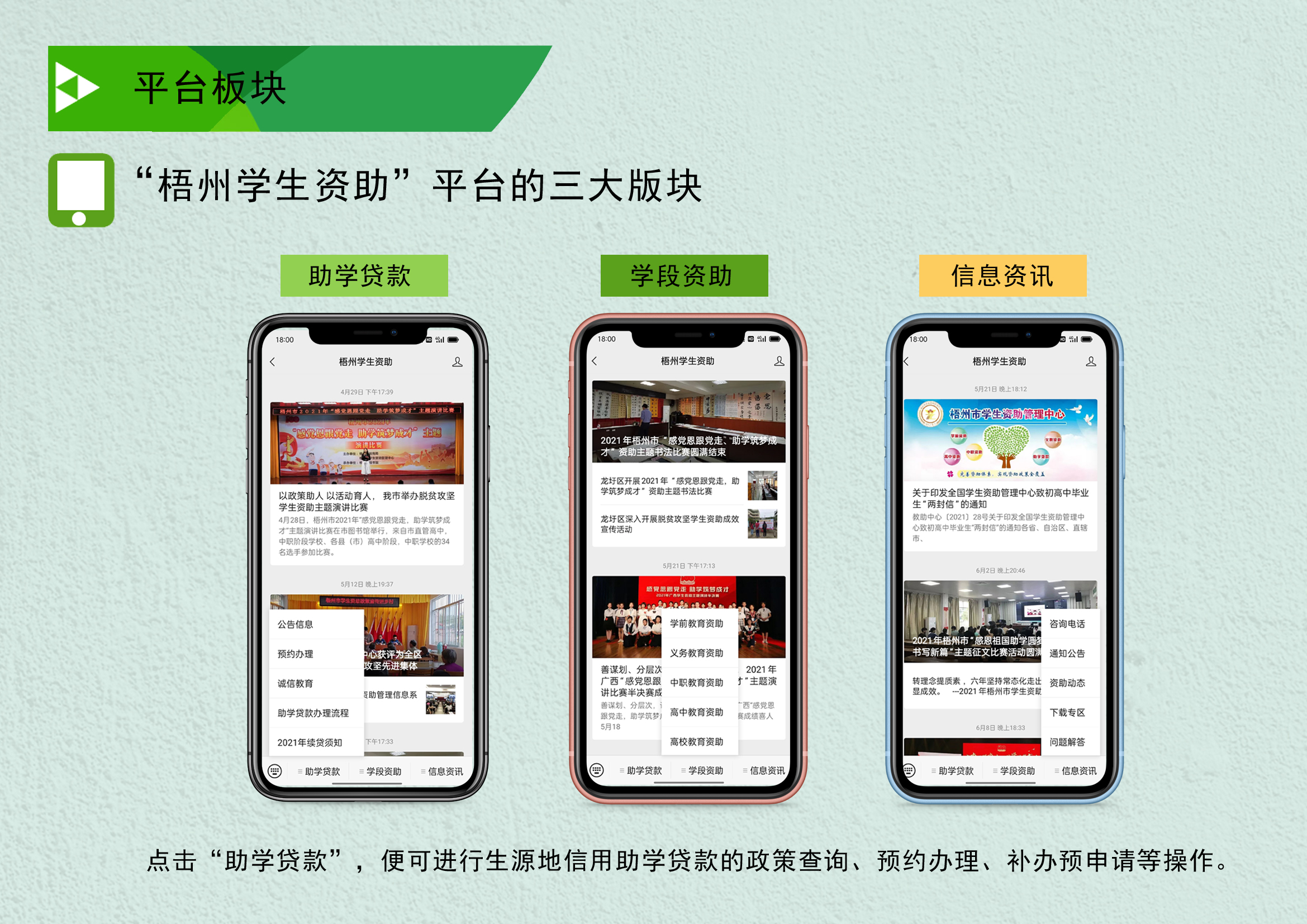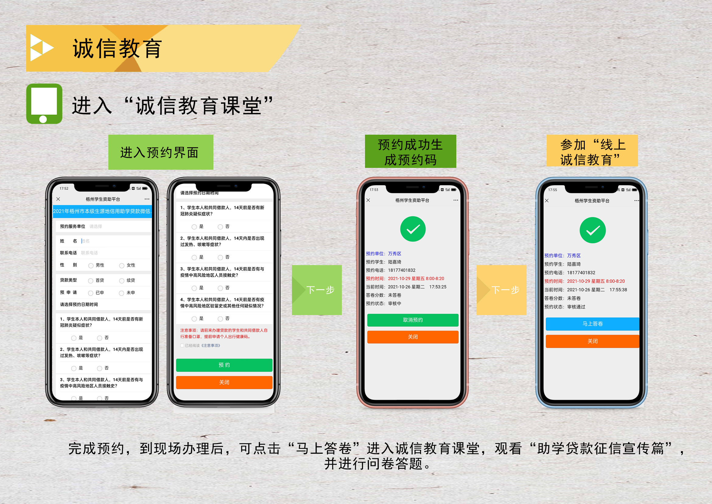 2017年4月,“梧州学生资助”微信公众平台建立,7月,梧州市教育局搬迁到市政务服务中心,这为开拓信息化诚信教育提供了一个很好的平台。首先,我们在办理现场专门开辟的一间办公室用作“诚信教育课堂”,安装了液晶电视,同时在微信平台开发了“诚信微教育”。学生和家长在办理的最后阶段,需要进入“诚信教育课堂”分批集中观看国家开发银行关于办贷还贷的诚信教育宣传短片,然后在手机上进行“诚信教育答卷”的填写,填写完毕后提交系统,系统会自动阅卷,满分的,志愿者才能好将贷款合同发给学生和家长,完成办贷。同时,为满足部分不会使用手机答卷的家长,我们还采用现场纸质填写《诚信答卷》的形式,不在手机完成答卷的,纸质完成也是允许的,就由志愿者现场批改答题卡获得答卷成绩。这样一个流程下来,“诚信教育课堂”弥补了人工讲解政策不完整、有疏漏、耗时又费劲的缺陷,大大提高了诚信办理助学贷款的政策知晓率,手机“诚信答卷”也减少了学生和家长等待时间、志愿者批改打分时间的缺点,提高了参与率和办理效率,根据我们现场统计数据表明,2017年诚信办贷政策宣传率达到98.75%,诚信教育率达到99.25%,办结一个贷款,耗时比原来缩短10—15分钟,在提升诚信教育有效率的同时也大大提升了办理的效率。当时的梧州日报和西江都市报以及梧州电视台都分别报到了我们的改革创新工作,在全区也是走在创新助学贷款工作方式前列的。全国学生资助管理中心副主任陈淑梅在召开2020年度生源地信用助学贷款受理工作启动会上提到,广西省梧州市微信公众号开设“诚信微教育答卷”和“微信提醒还款”功能,办理助学贷款的学生和家长,在现场观看宣传片后,可以在微信上直接答题,系统自动阅卷,调动了家长和学生的积极性,普及了相关的政策知识,做到了诚信教育全覆盖,这个创新工作手段,有效推动了生源地助学贷款办理信息化建设。