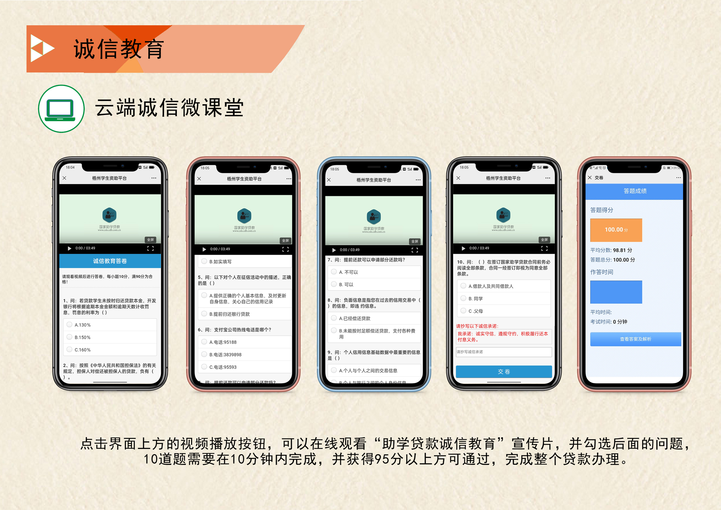 这给我们的诚信教育工作出了一道新考题。不集中办理,就意味着“征信教育课堂”不能开课,于是,我们在微信平台继续开发后台功能,在微信平台开设半屏式阅览界面,把诚信教育课堂转移到线上,即进入公众号,点开“诚信教育”界面,手机的上半屏就会开始播放国家开发银行统一制作的“诚信办贷还贷”的宣传片,下半屏则会显示“诚信答卷”的题目,这样现场办贷的学生和家长,就可利用等候时间,一边线上观看生源地信用助学贷款的宣传短片,一边在线答题,既避免了人员集中,也推动诚信教育进一步提速,据我们统计,这样可比原来分批观看宣传片后再答题,节省了5—8分钟,进一步提升了办理的效率。同时,我们询问了前来办理的学生和家长,他们觉得这样的方式,解读政策更入脑。我们的这个创新做法得到了国家开发银行和广西自治区教育厅的肯定,在全区的生源地信用助学贷款工作会上,梧州市学生资助管理中心代表梧州市作了题为“信息化引领助学贷款管理工作提质增效”的经验介绍和推广,受到全区其他地市兄弟单位的认可和好评。