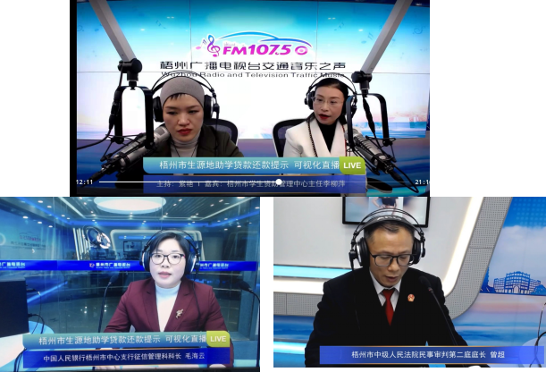 2021年,为提高诚信还贷率,减少国家资助资金的流失,增强社会公信力,我们连同梧州市中级人民法院,中国人民银行梧州市中心支行,通过梧州交通音乐之声做了《梧州市生源地信用助学贷款还款提醒》的专题可视化直播,不仅宣传了国家的助学贷款政策,同时依靠相关部门的身份,解读了违约法律后果以及个人征信的重要性,增加了社会对助学贷款诚信至上的认识,效果良好,得到自治区的肯定。