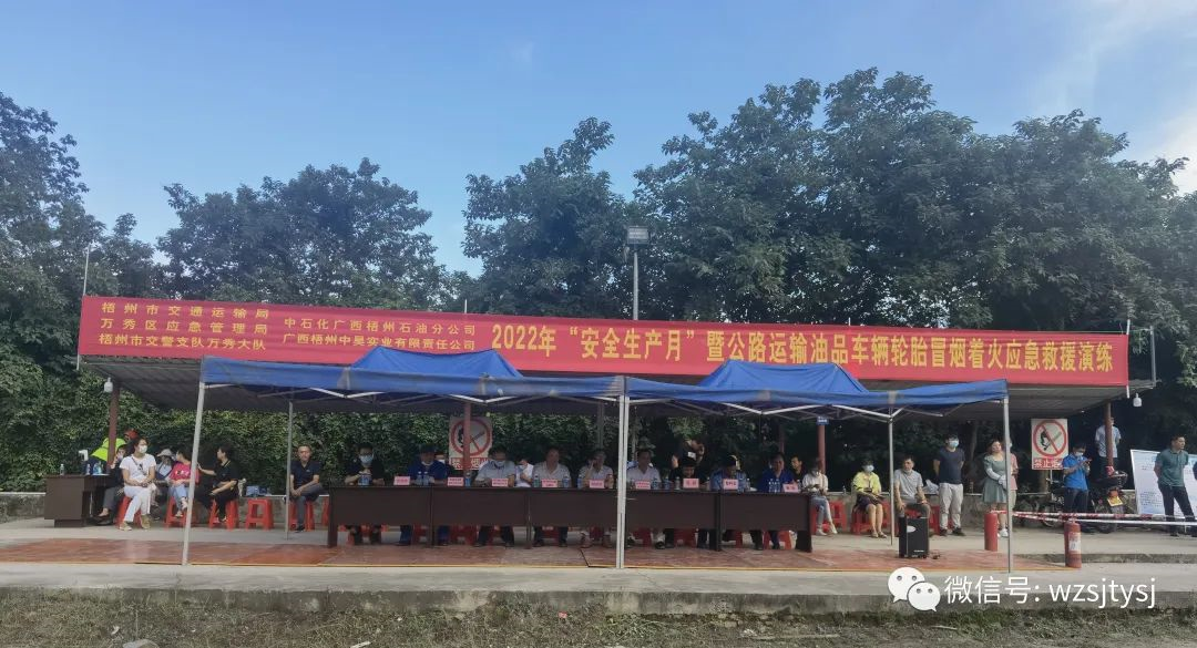 近日,为推动我市道路运输行业的信用体系建设,营造行业诚信氛围,同时也为了让道路运输行业从业者们树立起安全发展理念,加强应急救援能力建设,由梧州市交通运输局牵头组织、广西梧州中昊实业有限责任公司承办的,以“2022年‘安全生产月’暨公路运输油品车辆轮胎冒烟着火应急救援演练”为主题的公路运输应急演练及信用宣传活动在中昊公司车队高旺停车场举行。万秀区应急管理局、梧州市交警支队万秀大队、中石化广西梧州石油分公司、中昊公司全体员工及各危险货物道路运输企业安全工作负责人共同观摩了本次活动。