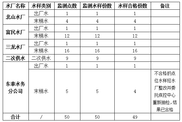 本季度抽检的50份水样,合格49份,合格率为98%,不合格的是梧州医学高等专科学校监测点的水样末梢水浑浊度项目结果超标(结果为1.2NTU,国家标准为≤1NTU)。综合该监测点所属市政供水出厂水检测结果分析,该监测点取样的水龙头设置在学校门卫,不合格原因可能与其日常用水量和管网清洗频率等因素有关。针对该监测点的情况,东泰水务分公司(龙圩区)立即整改并委托疾控中心对该监测点重新采样,结果合格。