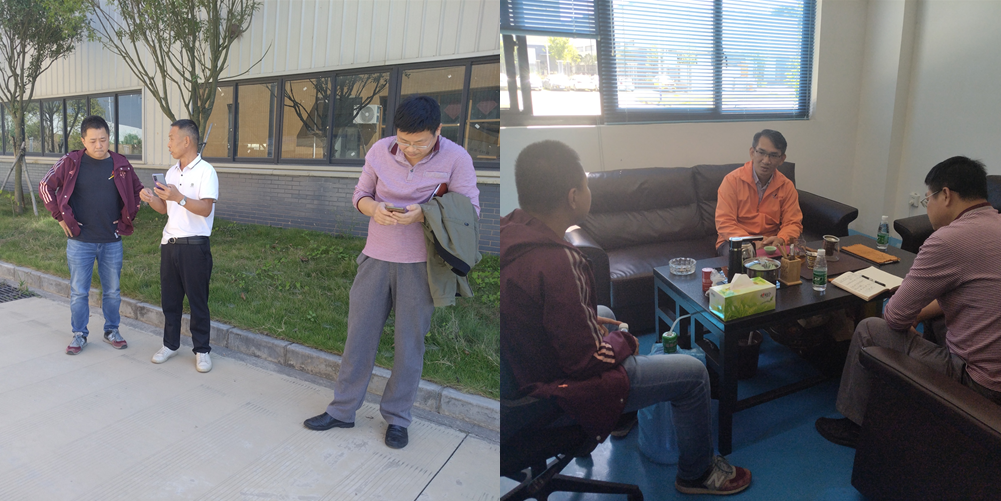 (粤桂试验区企业服务中心干部为企业协调解决问题及开展宣传信用工作,左图为德胜力公司,右图为花城公司)
