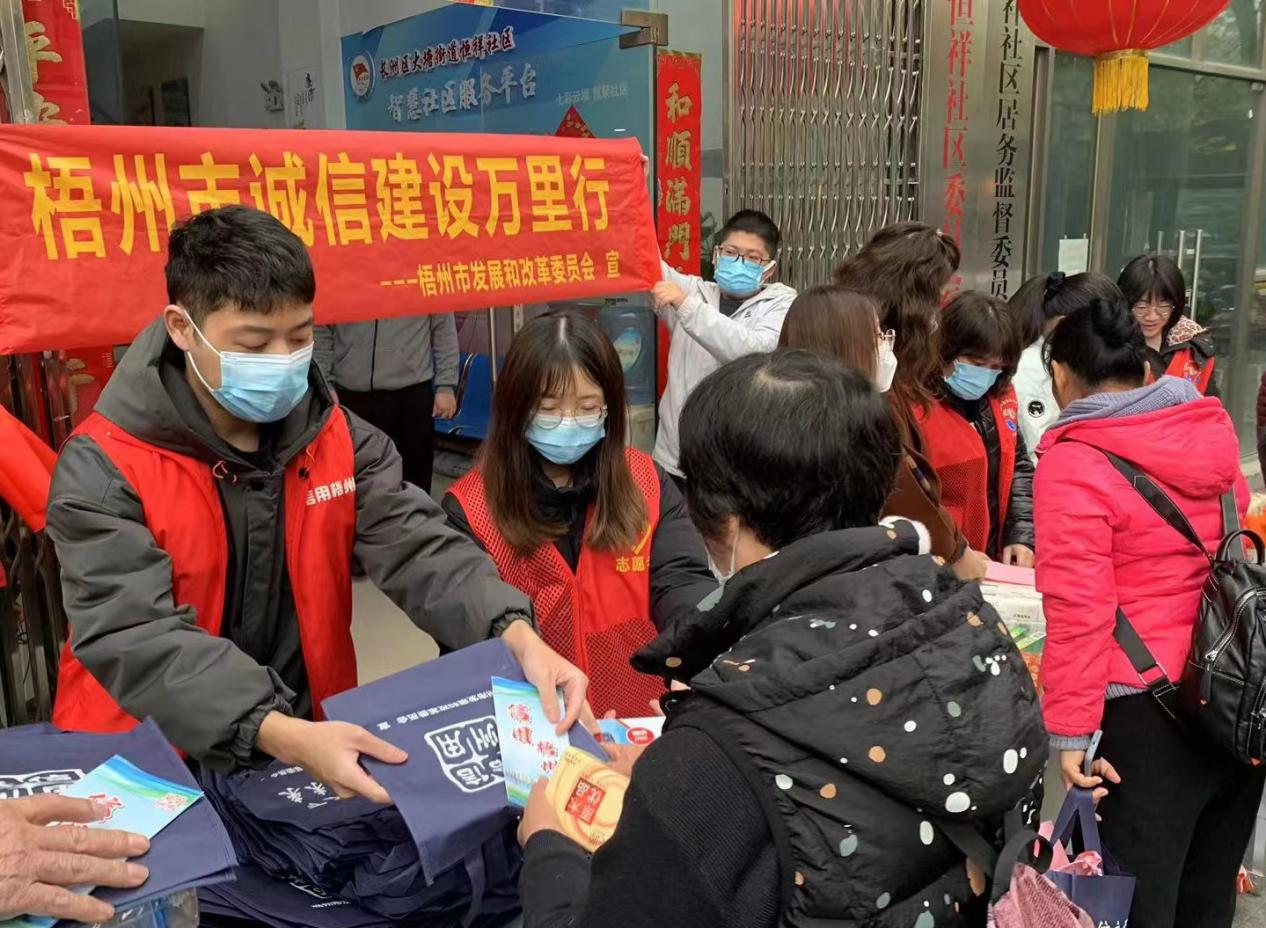 为进一步推进市社会信用体系建设,积极响应“2023年诚信建设万里行—信用宣传活动”,营造诚实守信的良好社会氛围,提升市民诚信意识。2月3日,梧州市发展和改革委员会到恒祥社区,开展诚信宣传进社区活动。