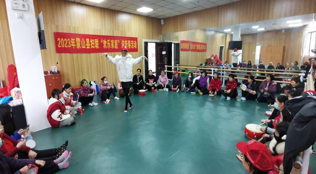 蒙山县妇联与梧州市明朗婚姻家庭心理服务中心共同在县妇儿活动中心组织老乡家园扶贫安置点妇女儿童开展“欢乐家庭”迎新春活动。活动中以“鼓”作为打击乐器,让参与者围成圆圈状,带领者站在中间,参与者跟随带领者做节奏、人声、声势、模仿、即兴编创或创作,让参与活动的家庭感受到欢乐与喜悦。