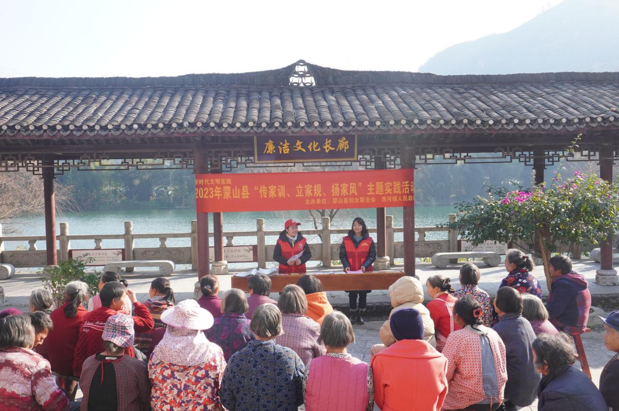 蒙山县妇女联合会联合西河镇人民政府在水秀村开展“传家训、立家规、扬家风、讲诚信”主题活动。活动上,蒙山县妇联副主席以“传家训、立家规、扬家风”为主题,结合经典事例、警句名言,围绕传承好家风好家训、讲诚信、重信用这一主题,引导广大群众传承家庭美德,树立诚信形象,增强了群众对家庭文明建设的认识,对于构建家庭友好型社会起到积极作用。鼓励广大妇女群众弘扬优良家风家训,从家庭文明建设的“旁观者”变成“参与者”大力弘扬向善的家庭美德,以家风文明促进社会文明。活动中也给妇女群众们宣传了关于铸牢中华民族共同体意识,维护民族团结进步的责任感和使命感。