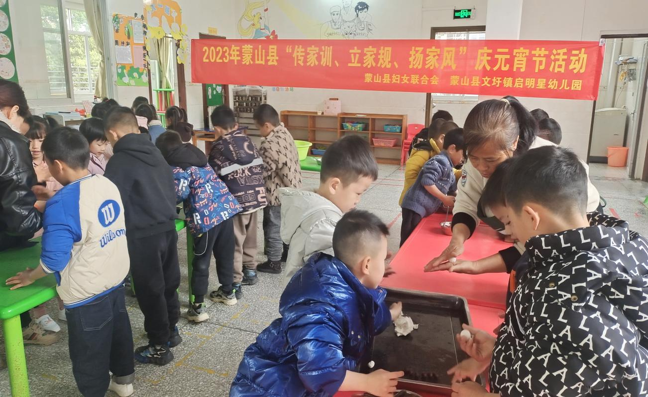 元宵节期间,县妇联和文圩镇启明星幼儿园、蒙山镇祥龙金宝贝幼儿园开展了“传家训、立家规、扬家风”主题活动。县妇联干部向小朋友们讲述了元宵节的由来及元宵节有哪些风俗习惯,引导小朋友们要热爱传统文化,厚植爱党爱国爱社会主义的情感,做德智体美劳全面发展的新时代好少年好儿童。随后还和老师一起为小朋友们展示了怎样包汤圆和做灯笼。此次活动寓教于乐,通过生动、有效的教育方式,让孩子们感受到了中华传统文化的独特魅力,让社会主义核心价值观在孩子们的心中落地生根。