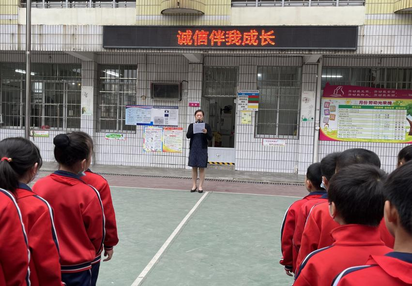 老师为全校同学进行以“诚信是人生立身之本”为题的国旗下讲话。教育学生从日常中入手、从小事做起,在待人接物中,讲诚信、守承诺,充分利用现实生活中有关诚信的典型案例和人物,歌颂正面,抨击不诚信的人和事,让学生时刻收到教育和熏陶。