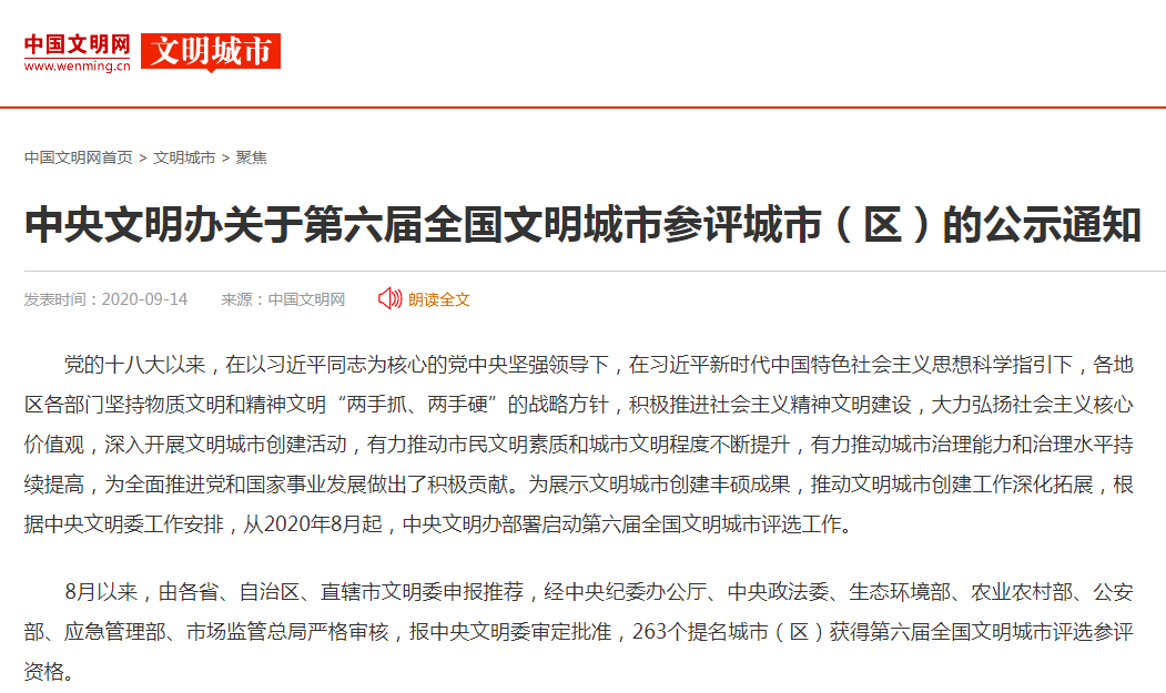 9月14日,中央文明办在中国文明网正式发布关于第六届全国文明城市参评城市(区)的公示通知,公示名单中,263个城市(区)获提名,其中我们梧州市、蒙山县分别上榜。