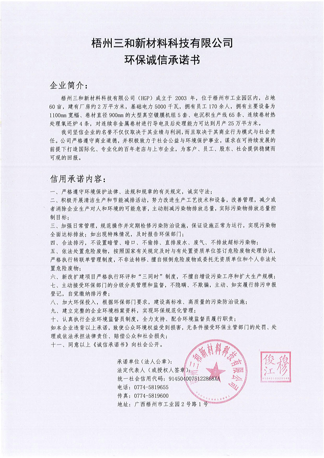 梧州三和新材料科技有限公司环保诚信承诺书