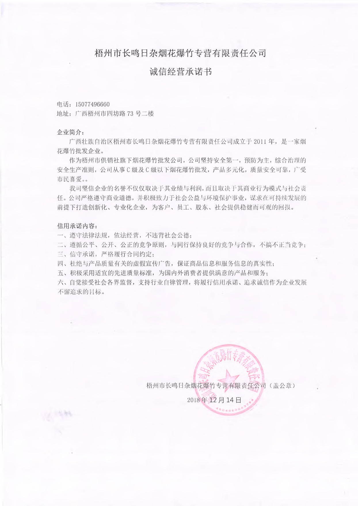 梧州市长鸣日杂烟花爆竹专营有限责任公司诚信承诺书