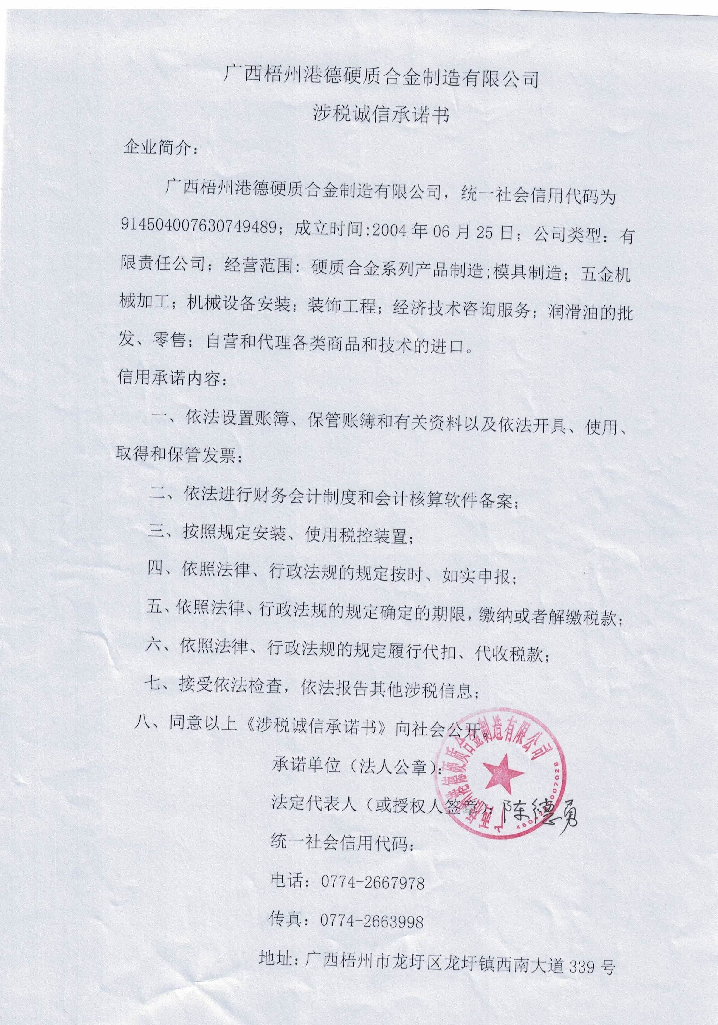 广西梧州港德硬质合金制造公司涉税诚信承诺书