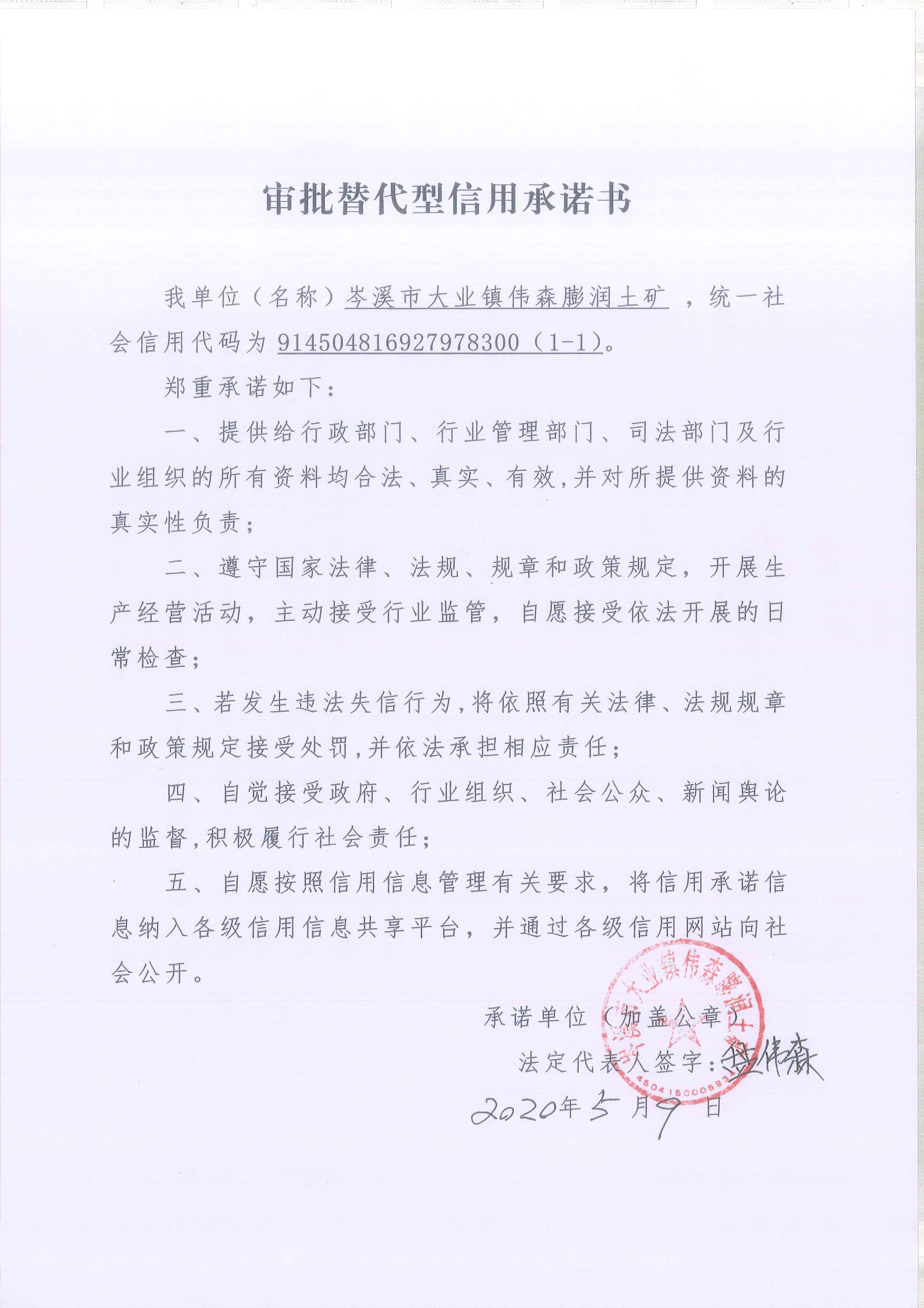 岑溪市大业镇伟森膨润土矿审批替代型信用承诺书