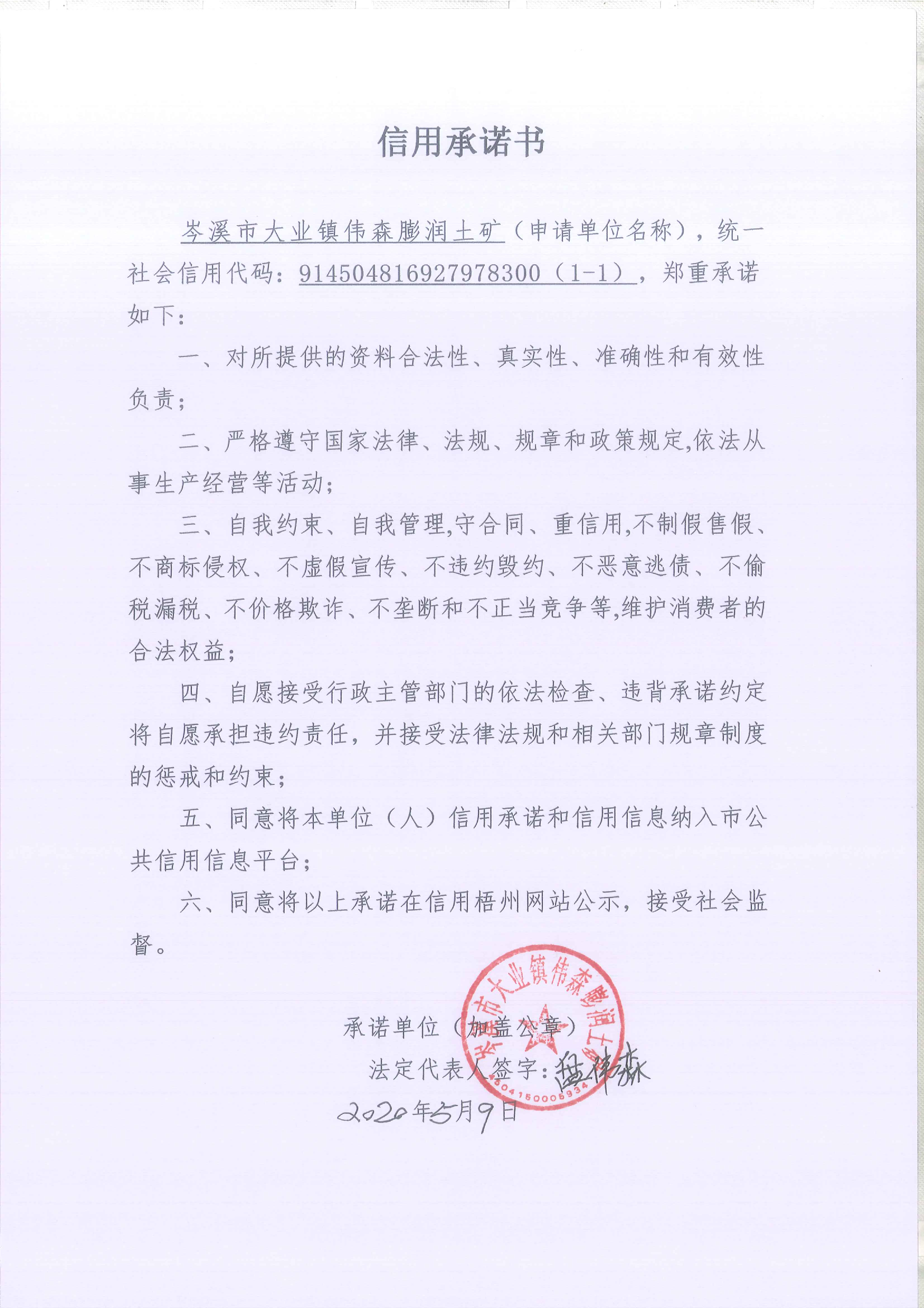 岑溪市大业镇伟森膨润土矿信用承诺书