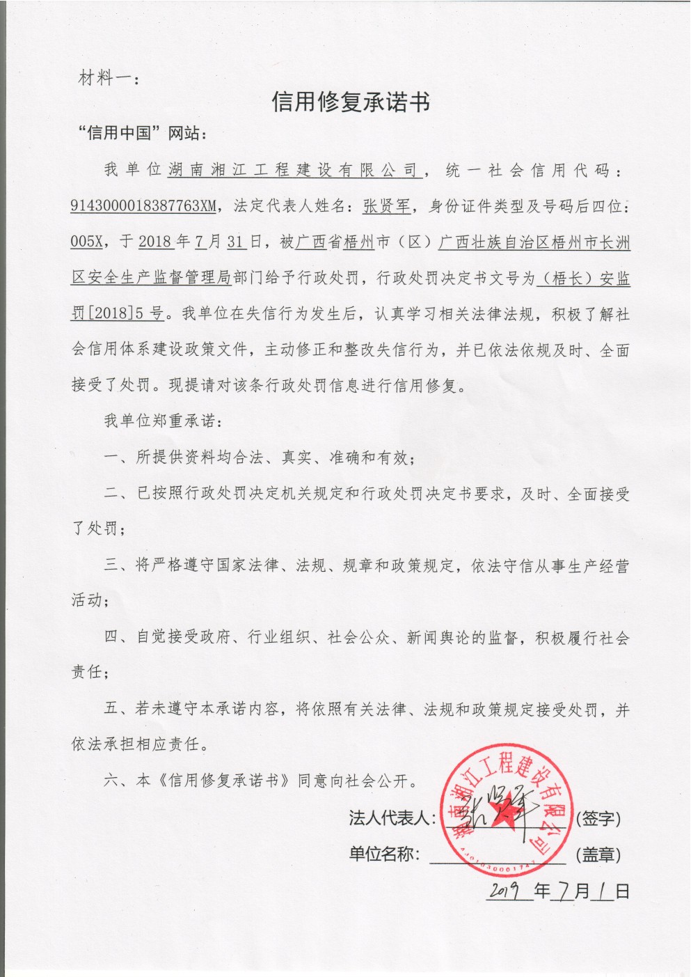 湖南湘江工程建设有限公司信用修复信用承诺书