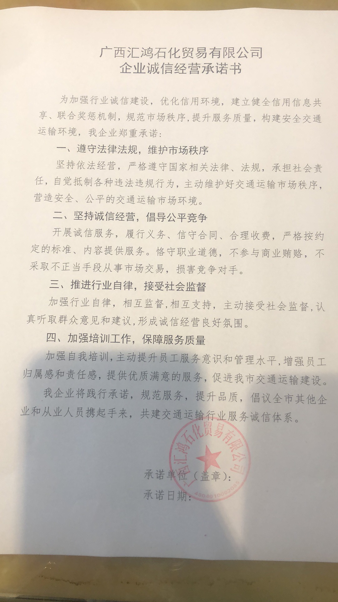 广西汇鸿石化贸易有限公司企业诚信经营承诺书