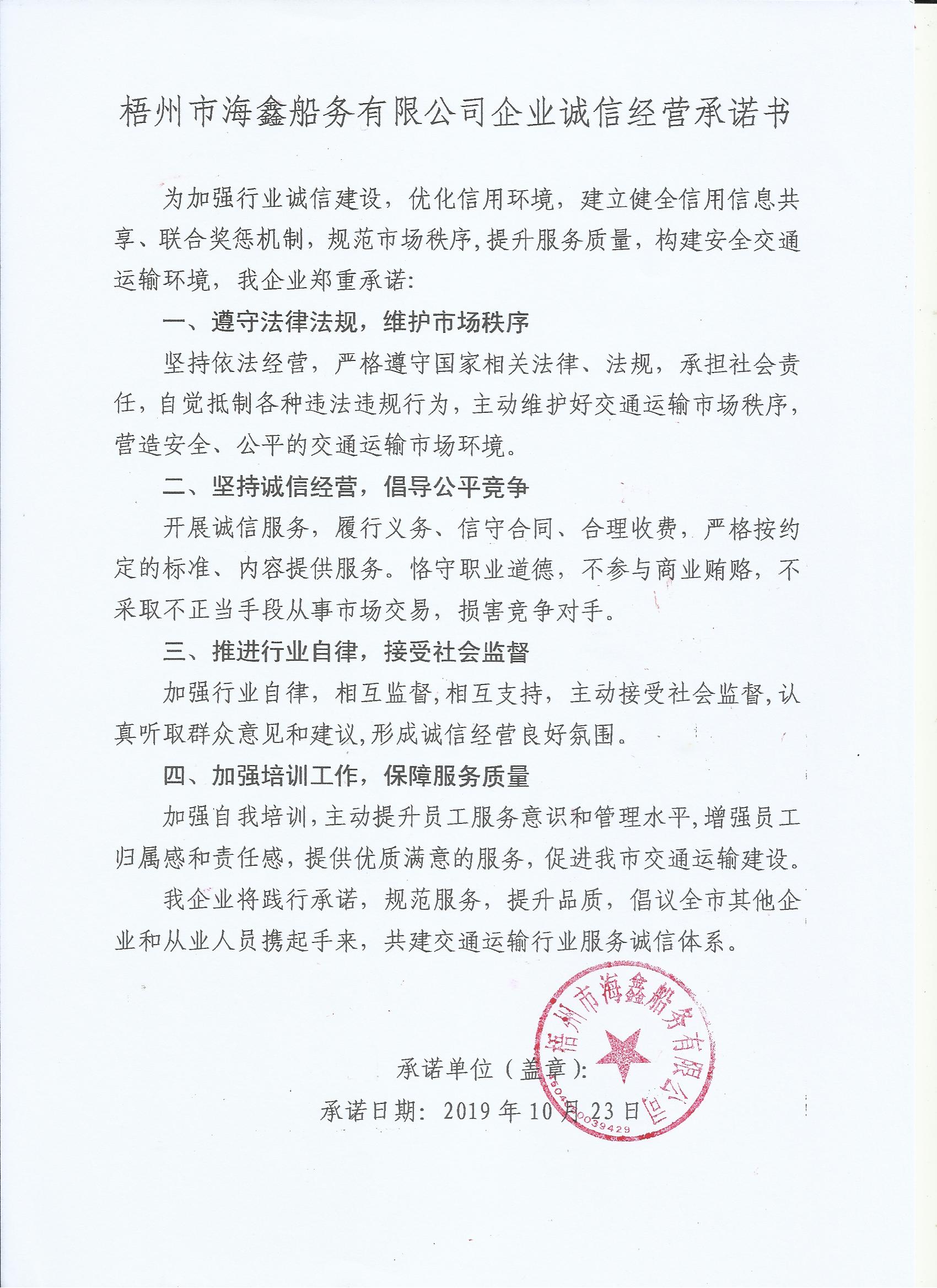 梧州市海鑫船务有限公司企业诚信经营承诺书
