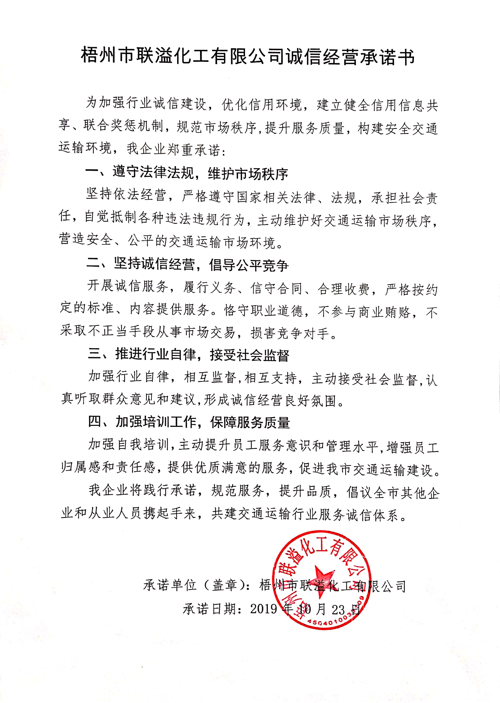 梧州市联溢化工有限公司诚信经营承诺书