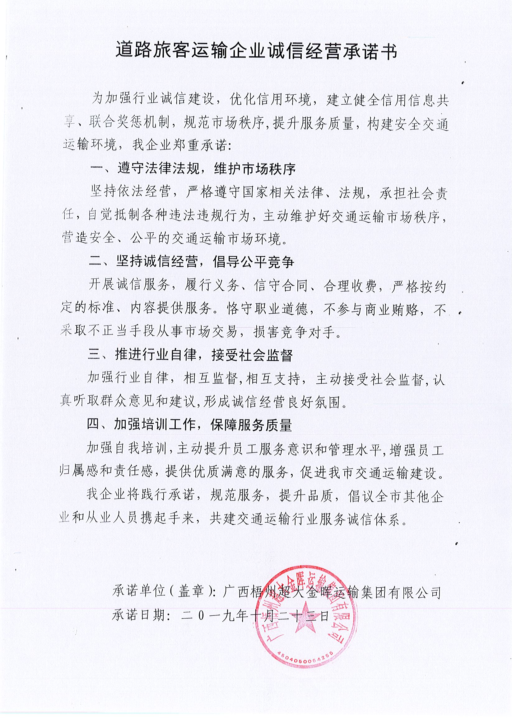 广西梧州超大金晖运输集团有限公司企业诚信经营承诺书