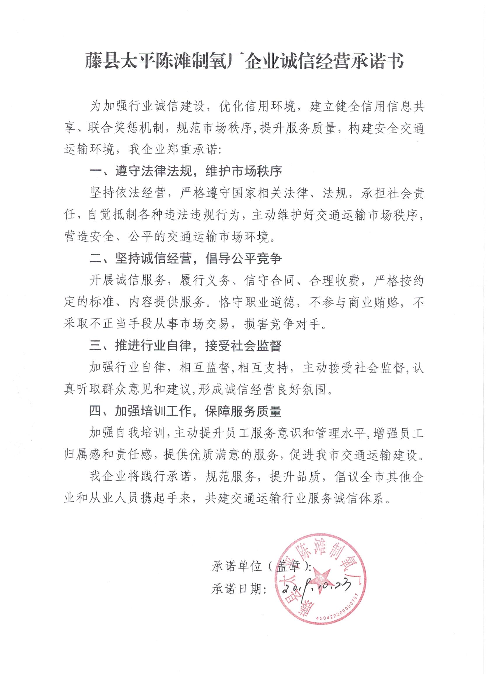 藤县太平陈滩制氧厂企业诚信经营承诺书