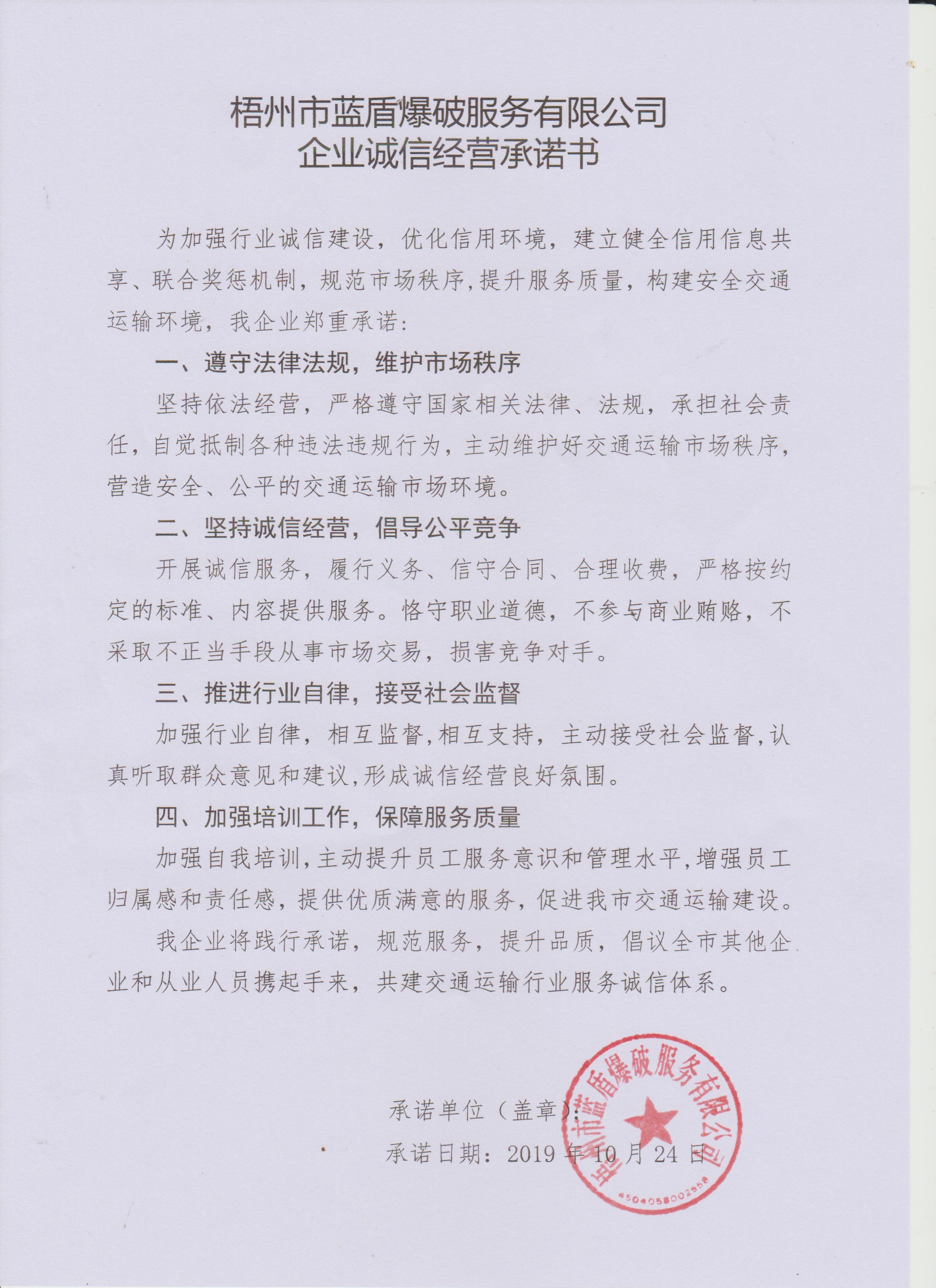 梧州市蓝盾爆破服务有限公司企业诚信经营承诺书