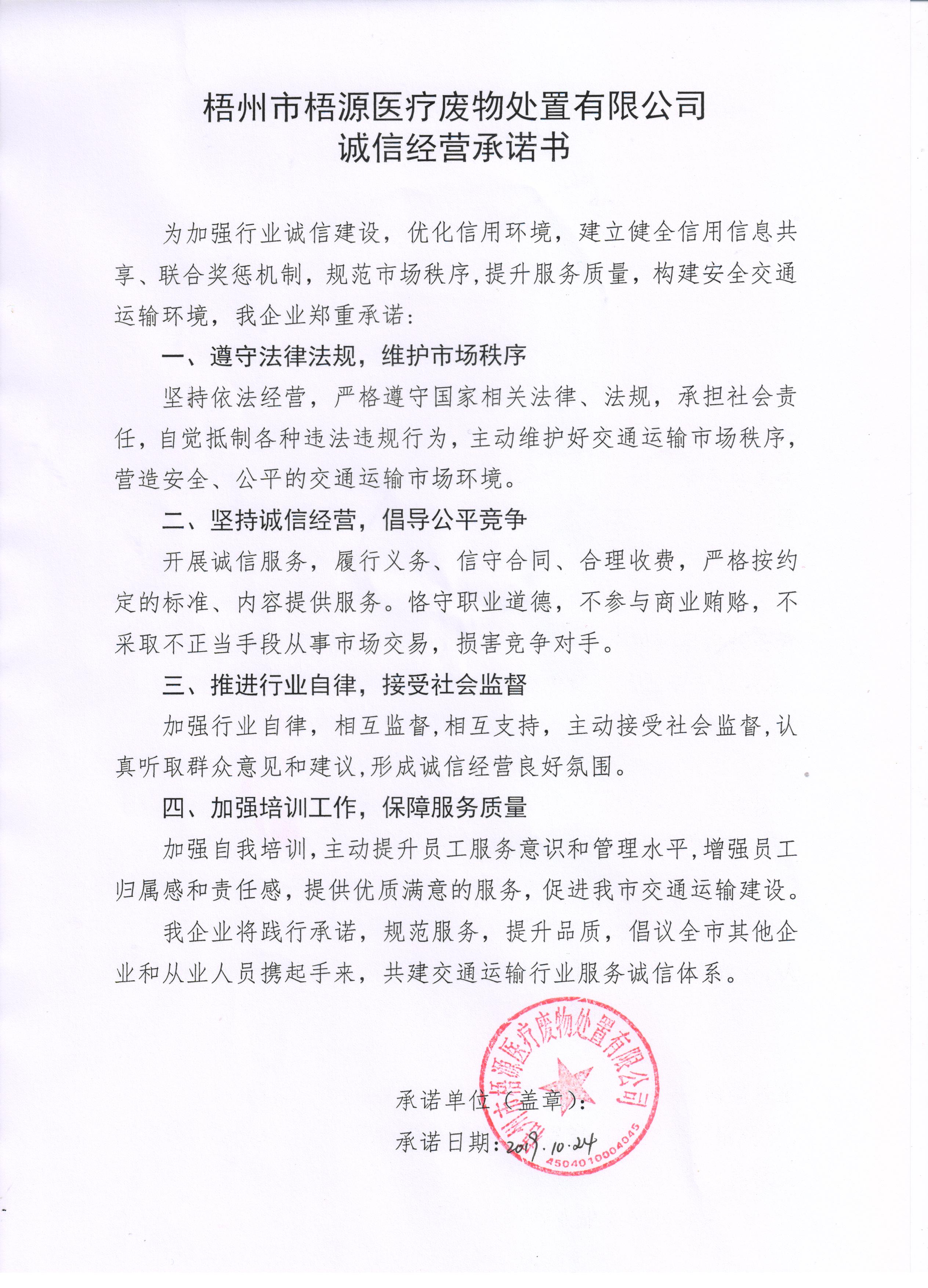 梧州市梧源医疗废物处置有限公司企业诚信经营承诺书