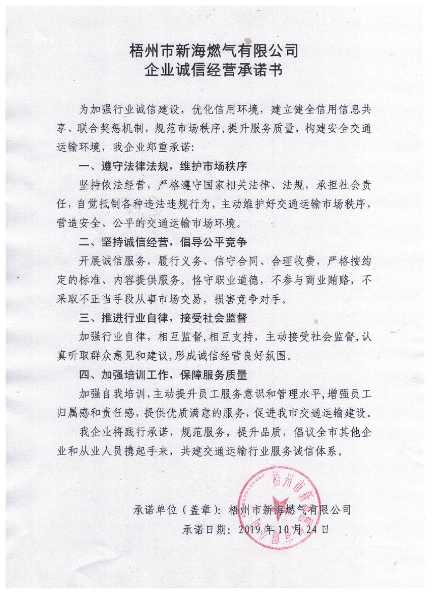 梧州市新海燃气有限公司企业诚信经营承诺书