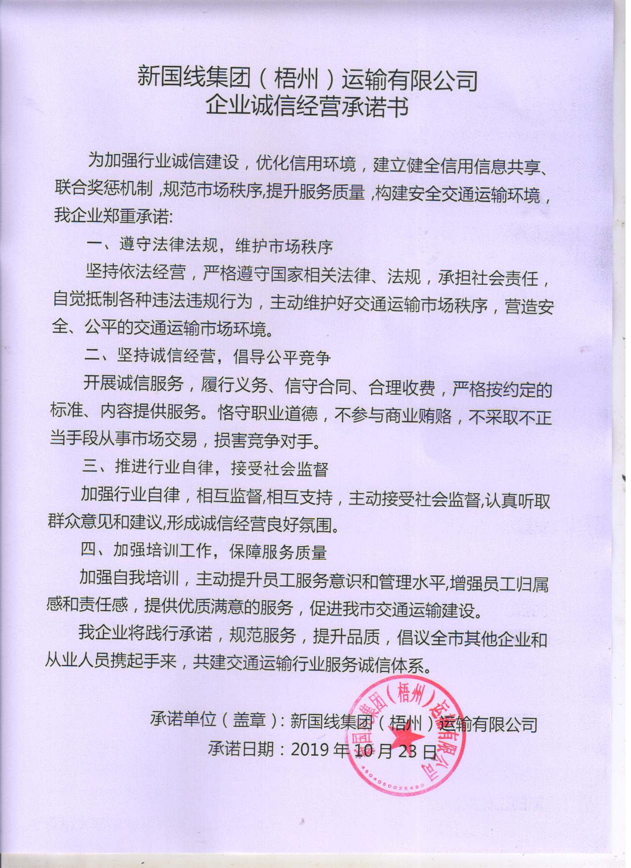 新国线集团(梧州)运输有限公司企业诚信经营承诺书