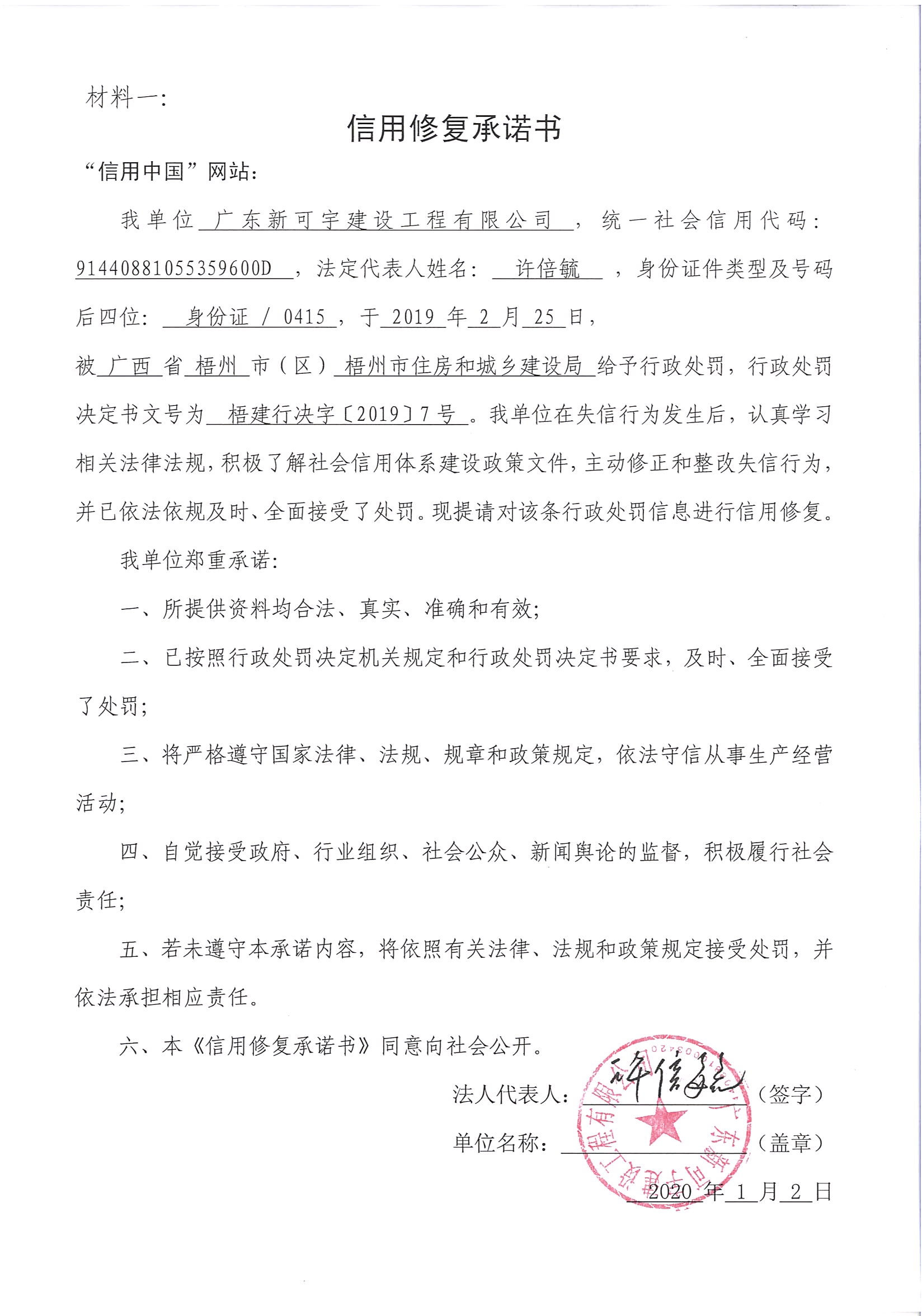 【信用修复承诺书】广东新可宇建设工程有限公司